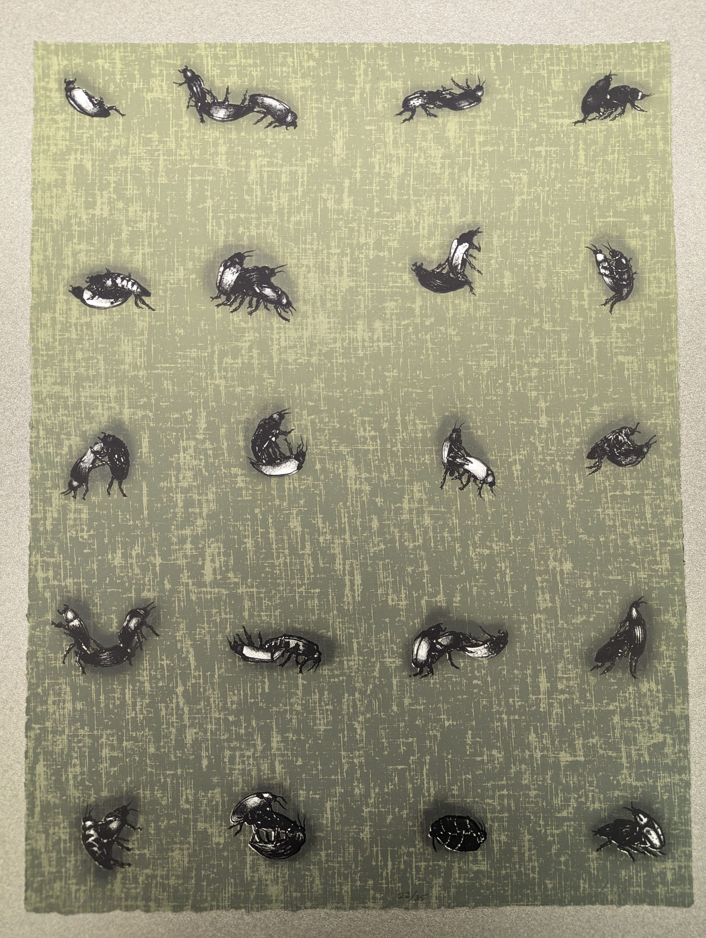A large vertical print depicting twenty evenly-spaced scenes (four columns by five rows) of beetles in anthropomorphic sexual positions. The background is green, darker towards the lower half, with a lighter green pattern of scratchy perpendicular lines going throughout.Context