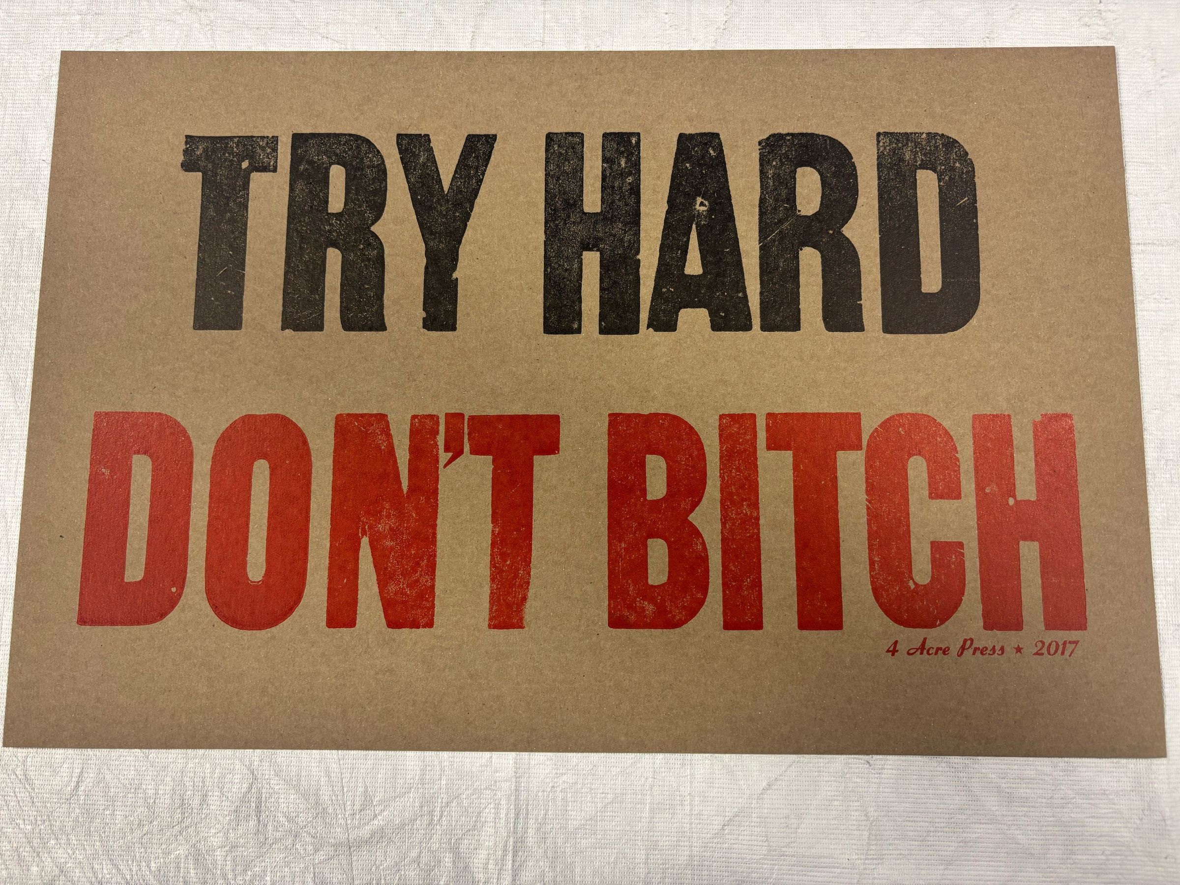 Medium, rectangular, horizontally-oriented print of the words "Try Hard" capitalized in black and "Don't Bitch" in red on cardboard. At the bottom corner are the words "4 Acre Press [star symbol] 2017" in red.Collection