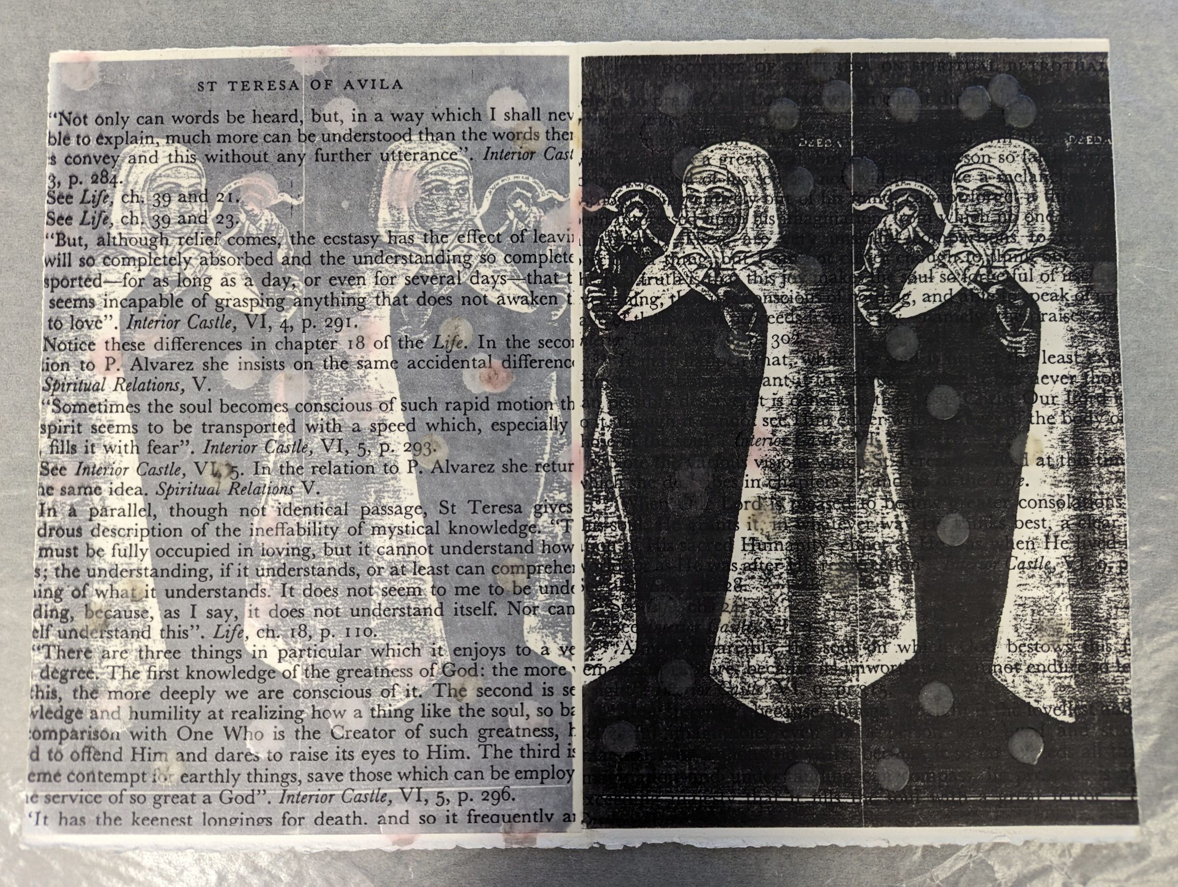 A medium, horizontally-oriented print with left and right halves; on each half are two illustrations of the same woman in religious garb looking towards the center. The left is gray while the right is black, and over all of it are pinkish dots scattered around. Over both halves are bodies of text; at the top left is titled "ST TERESA OF AVILA."Context