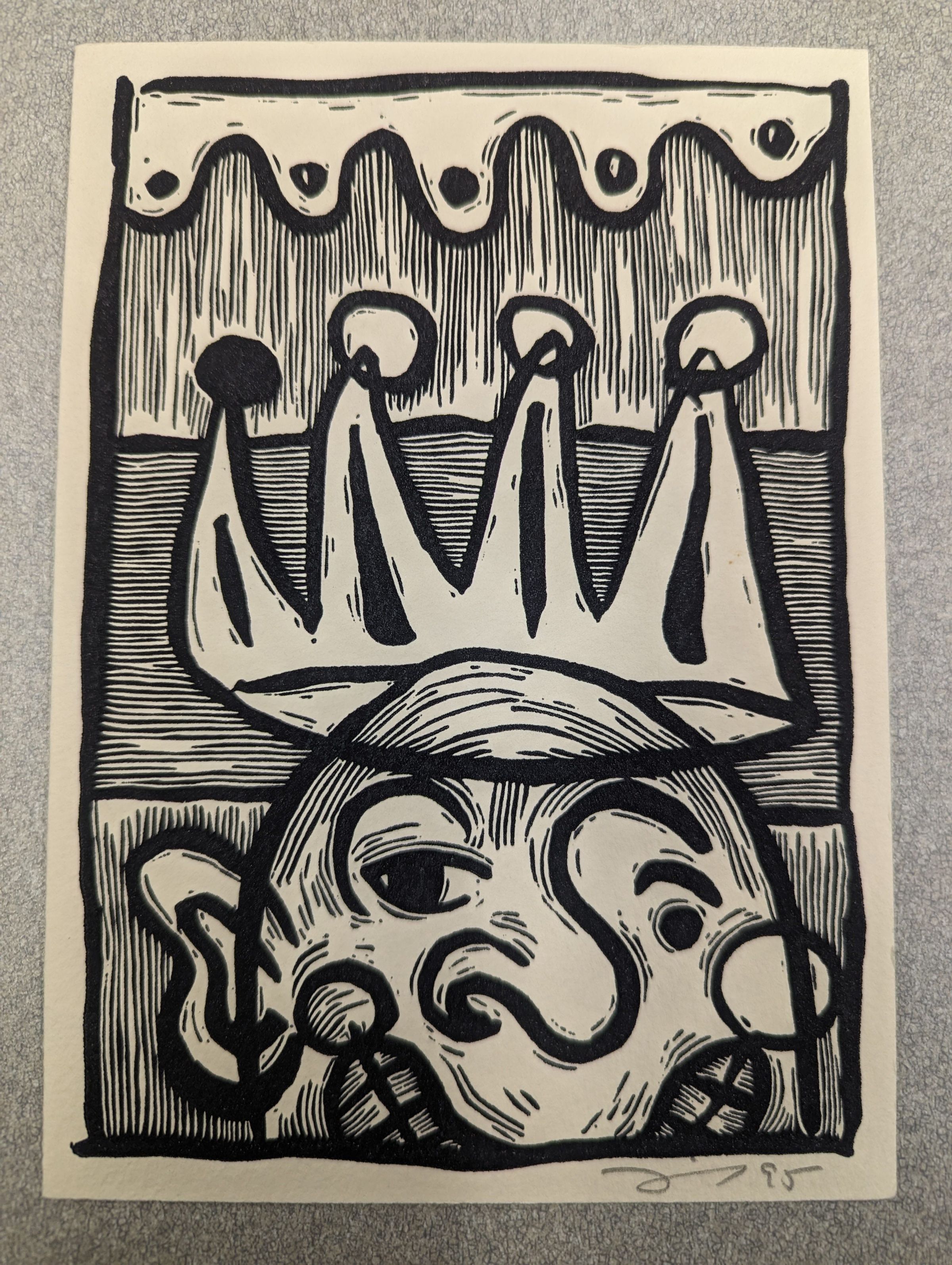 A small print, heavily stylized and cartoonish in thick black contours. It shows a winking, grinning bald head from the mouth up with a clownish crown on its head, behind which is a tiered design with drooping dots at the top. The print is on folded cardstock. The back of it is printed with "Tymeson Editions" and "F." Inside the card is faded text.Context