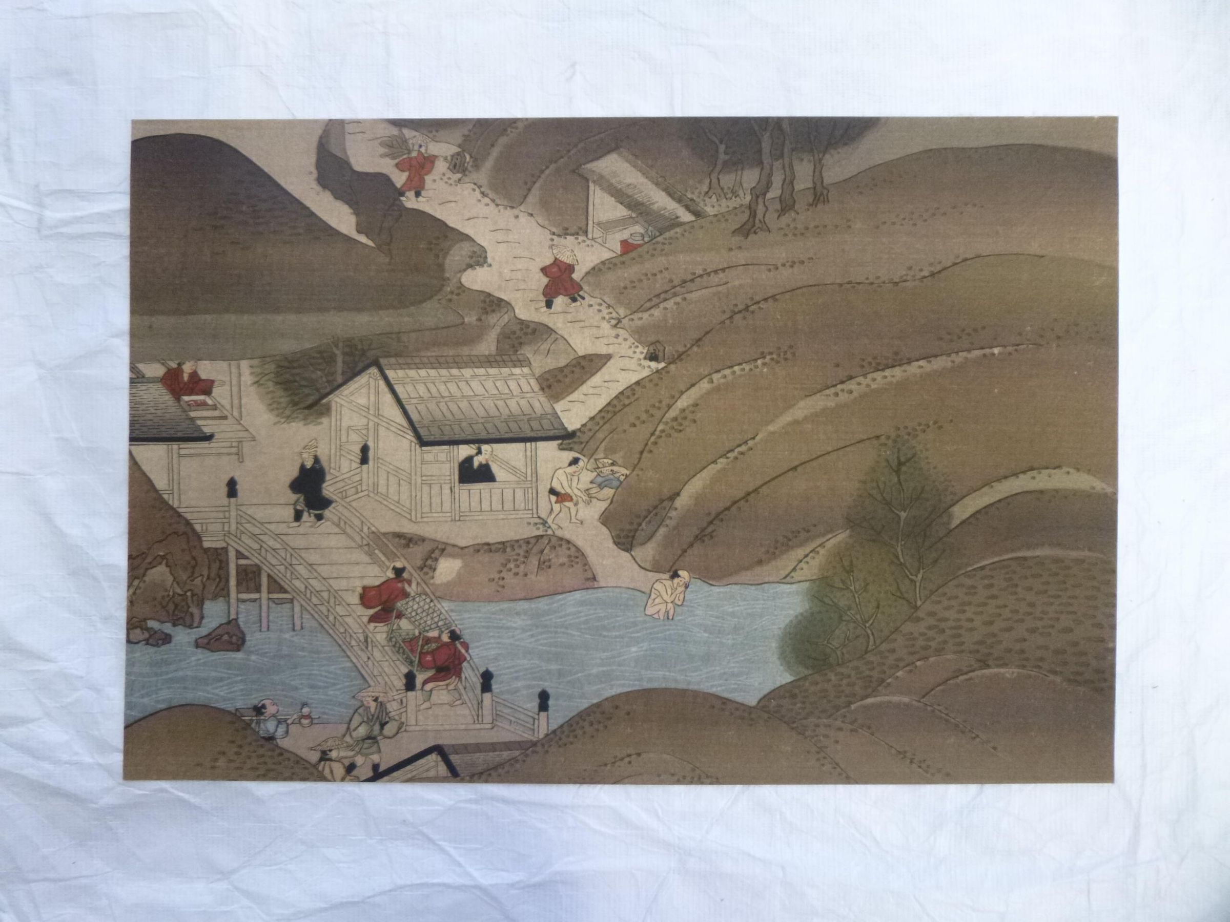 A small, horizontally-oriented print of a landscape scene of the outskirts of a village with twelve figures. The figures are in the midst of various activities such as conversing, walking, and bathing.Collection