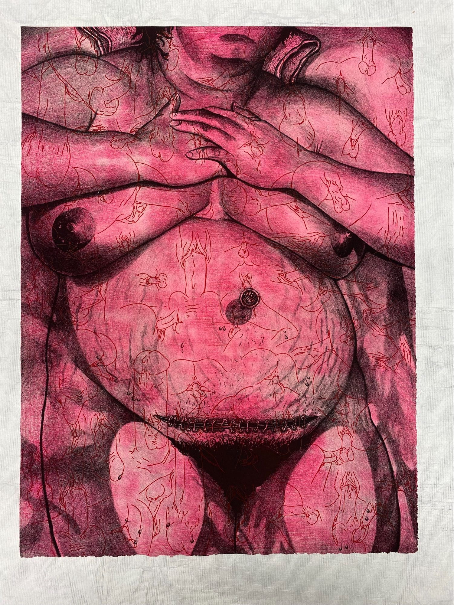 Nude figure holding on to their chest with scaring depiction underneath belly. Red phallic and clitoris imagery engaging in sexual acts are screen printed on top of the nude.Collection