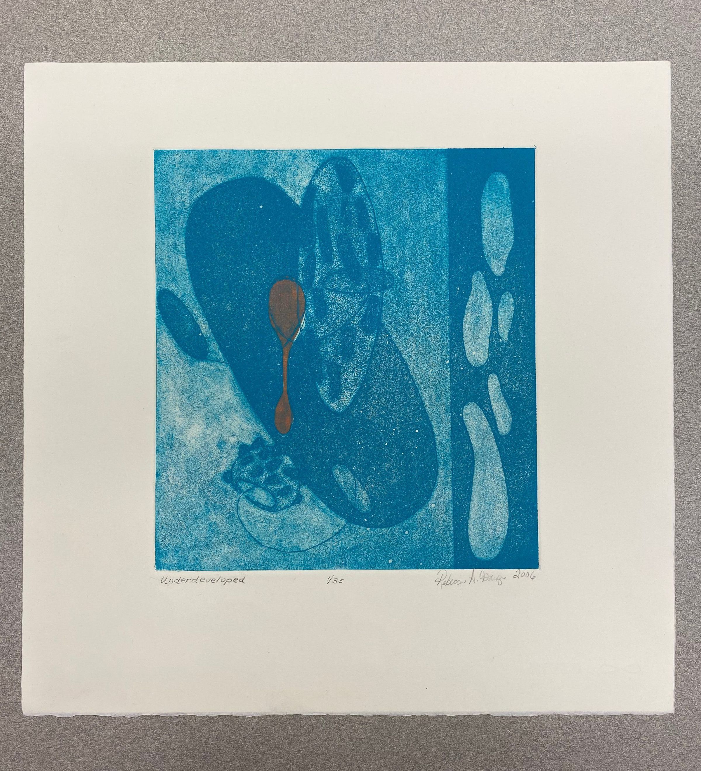 A medium size vertically oriented print of an abstract design in majority blue tones. The print contains two panels; the left panel takes up a third of the image space within a pale blue backdrop and darker blue forms, with a distinct orange drip mark at its upper center. The right panel contains a dark blue back drop with five ovular blue shapes that run vertically.Collection