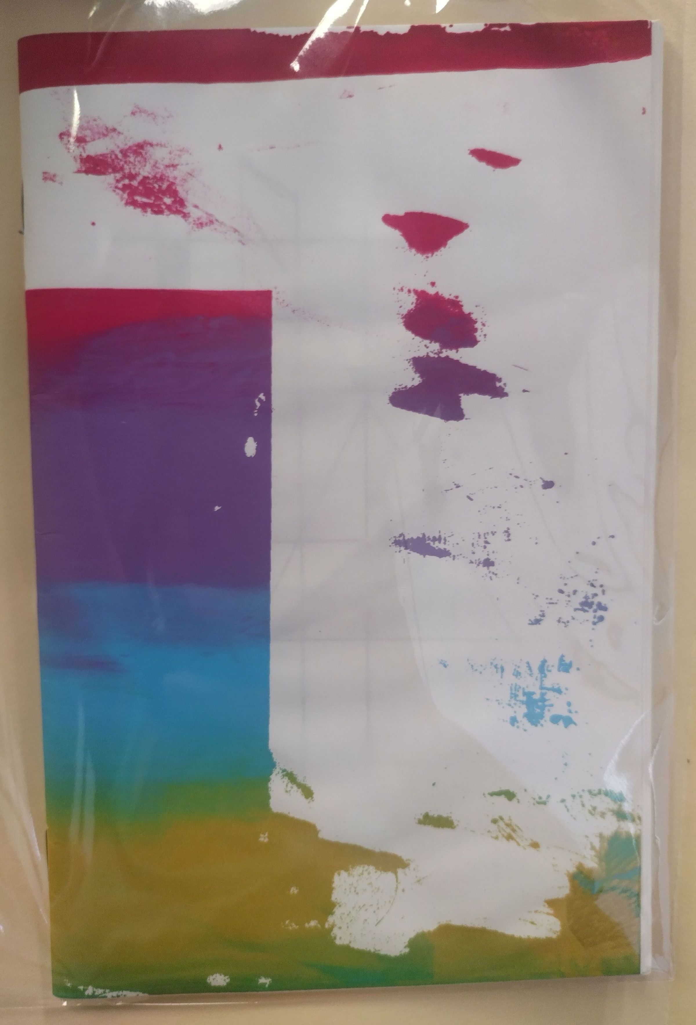 Small white paper booklet with multicolored paint of the covers. Front cover has a red border along the top edge and a vertical rectangle block on the left side with red, purple, blue, green, yellow, green paint. Rnadome blotches of paint take up the rest of the front cover. The back cover has a continuing red border along the top, followed by a white block and then complete color coverage in purple, blue, and yellow horizontal blocks.Context