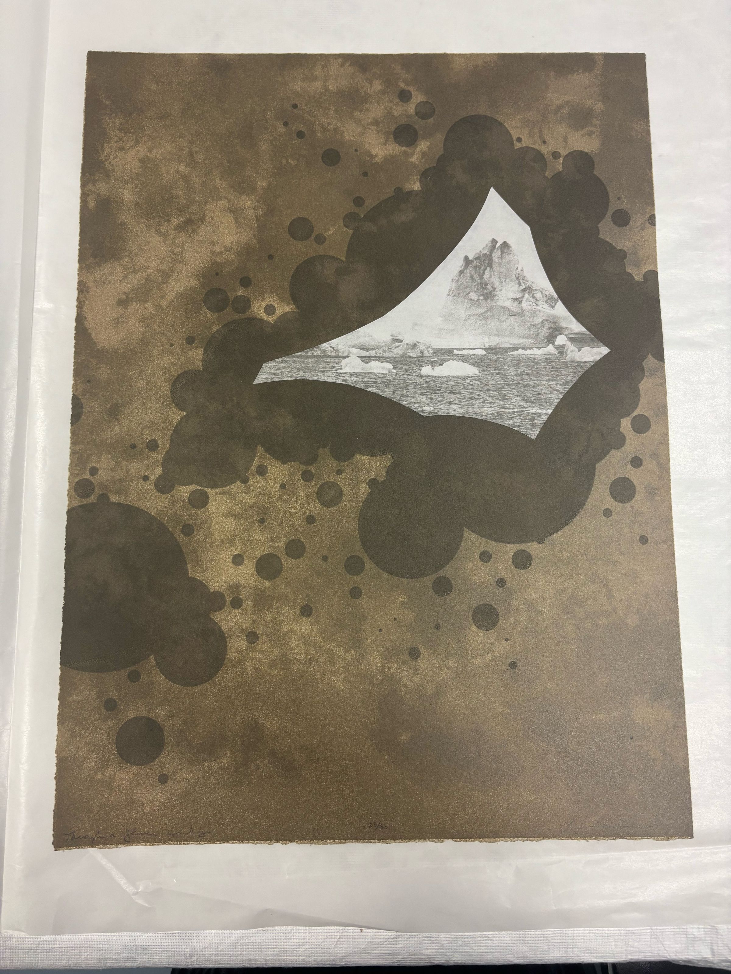 Large rectangular vertically oriented print depicting a white glacier surrounded by a dark oil like stain against a brown background.Context