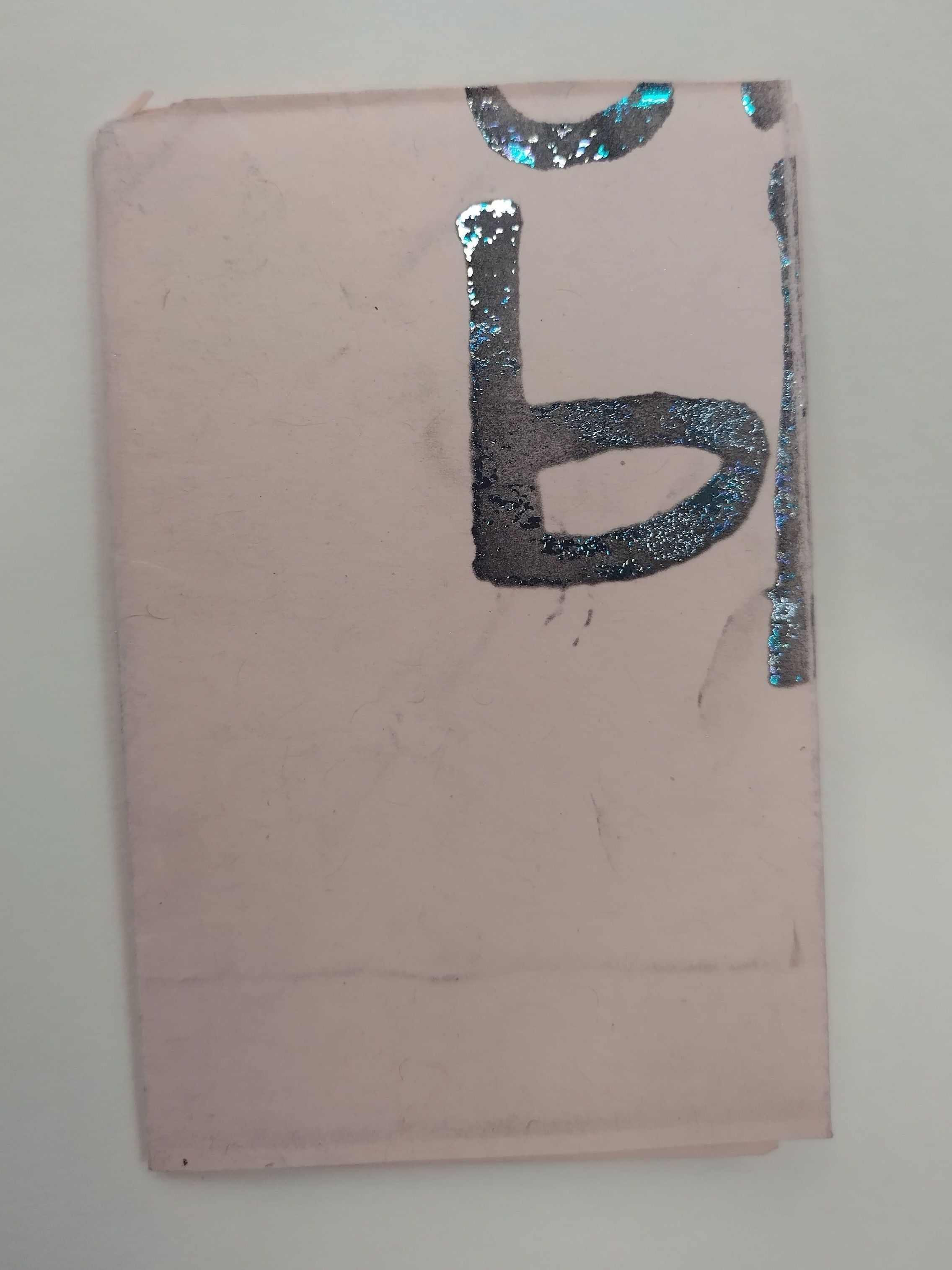 Small light peach paper, cut and folded, with copy printed images with multi-colored foil applique on the darker portions. The Front cover has a lower case "b" figure on the top right side with a small half-circle above it. The back cover is blank with the exception of some faint grayscale markings.