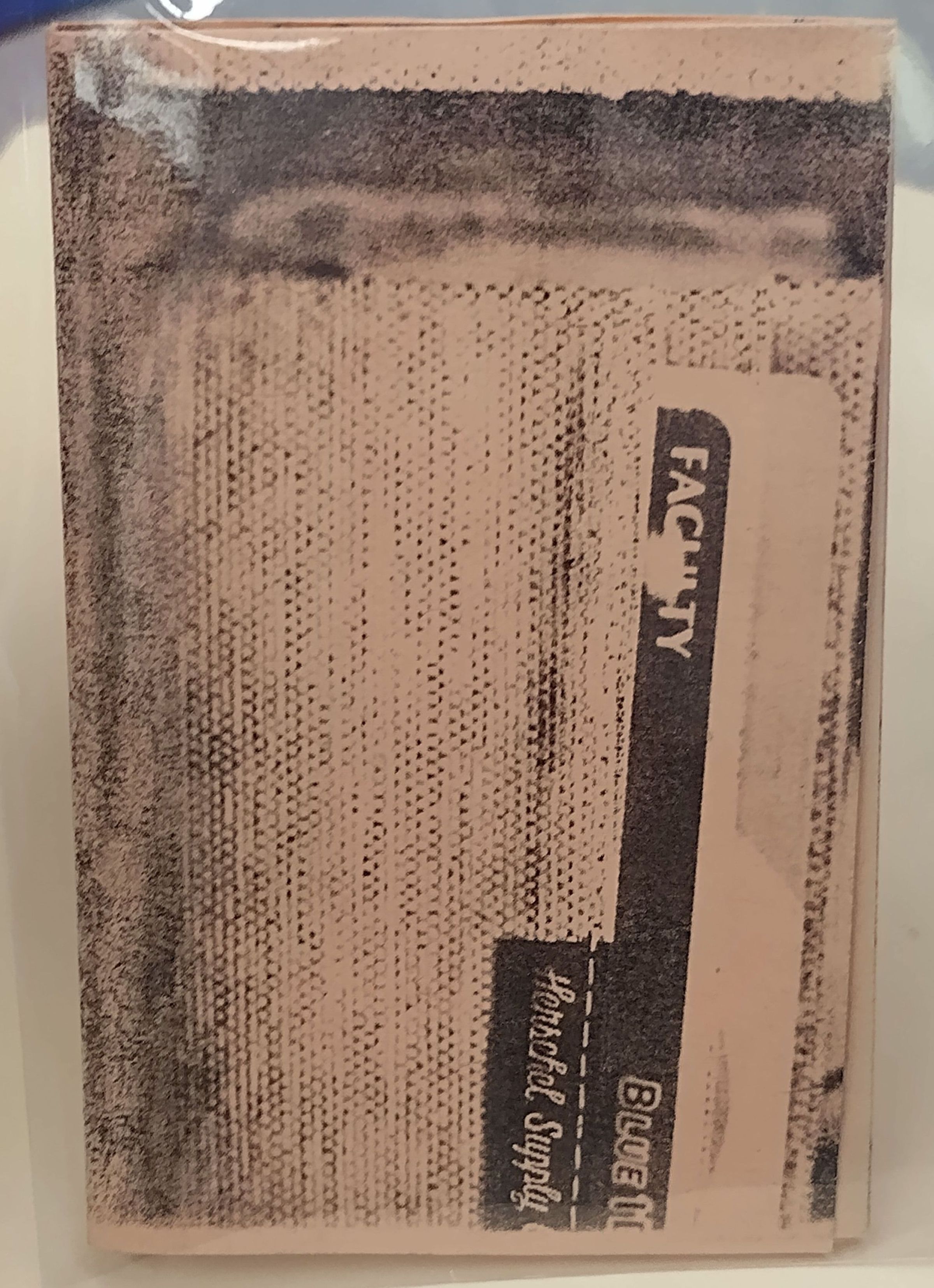 Small peach folded and cut paper booklet with black and white copy printed images of various objects. The front cover is overtaken by a dotted wallet with a "Faculty" card in the sleeve visible on the center right side, with a brand tag at the lower right side. The back cover is composed of a collection of unidentifiable items. Piece can be unfolded to reveal a complete image.Context