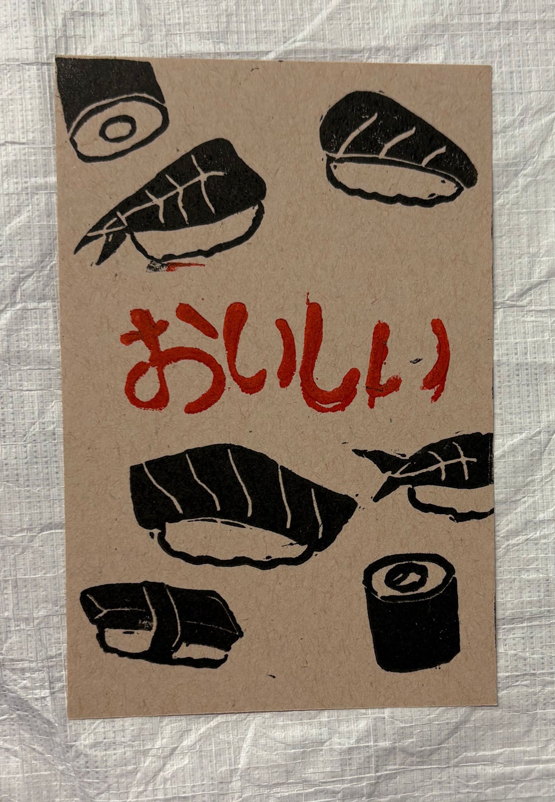 A small, vertically oriented print that uses both imagery and text. The print is done on a tan colored ground with the central portion of the print consisting of text in a foreign symbol format, and radiating outwards from that text are 7 sushi rolls that litter the negative space of the print.