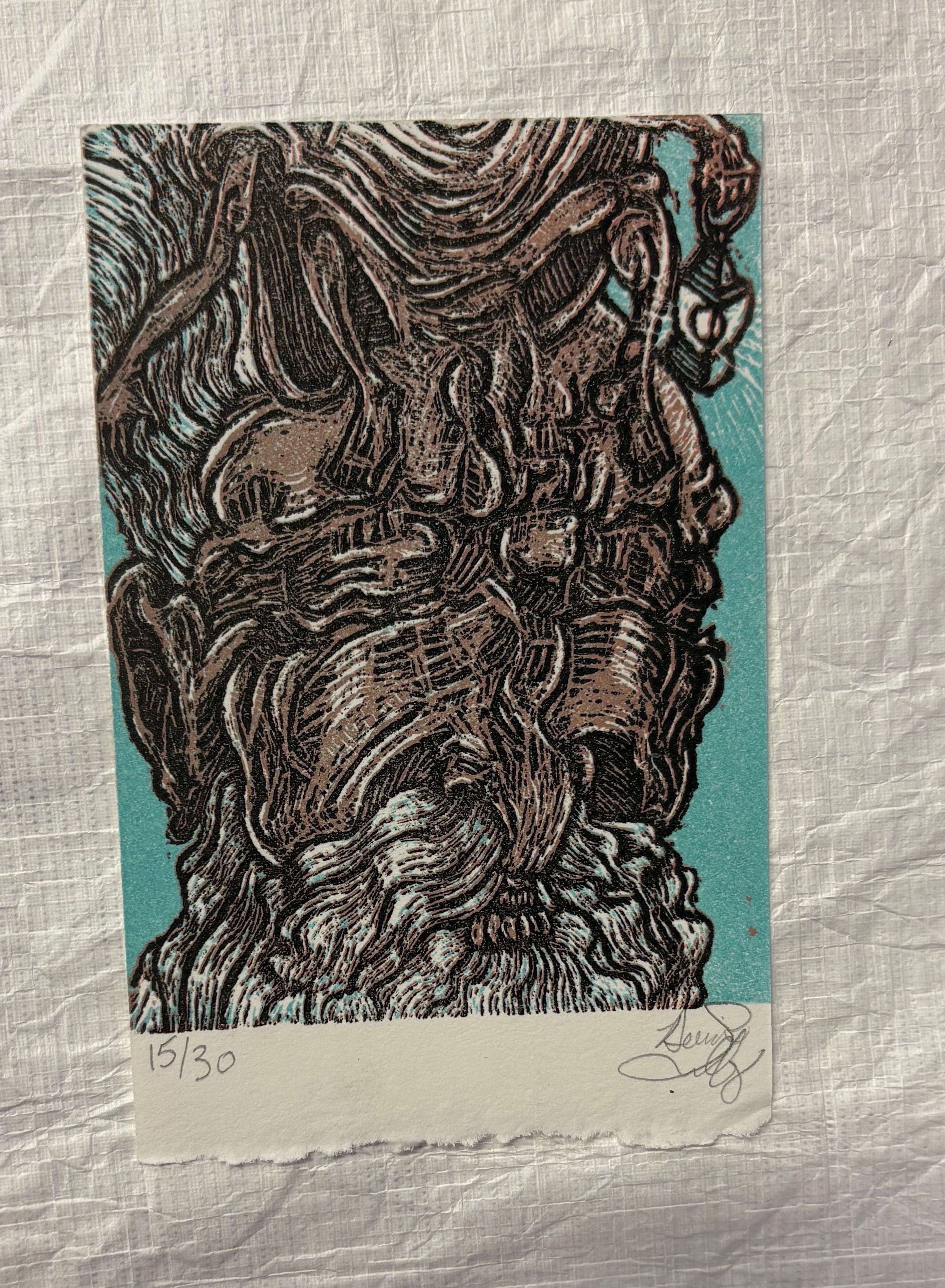 A small, vertically oriented print that utilizes multiple colors such as blue, brown, black and white to construct the print. The main image of the print is an abstract rendition of what looks like and aged face. Also upon this face is an amalgamation of body parts that sit at the top of the face holding a lantern.