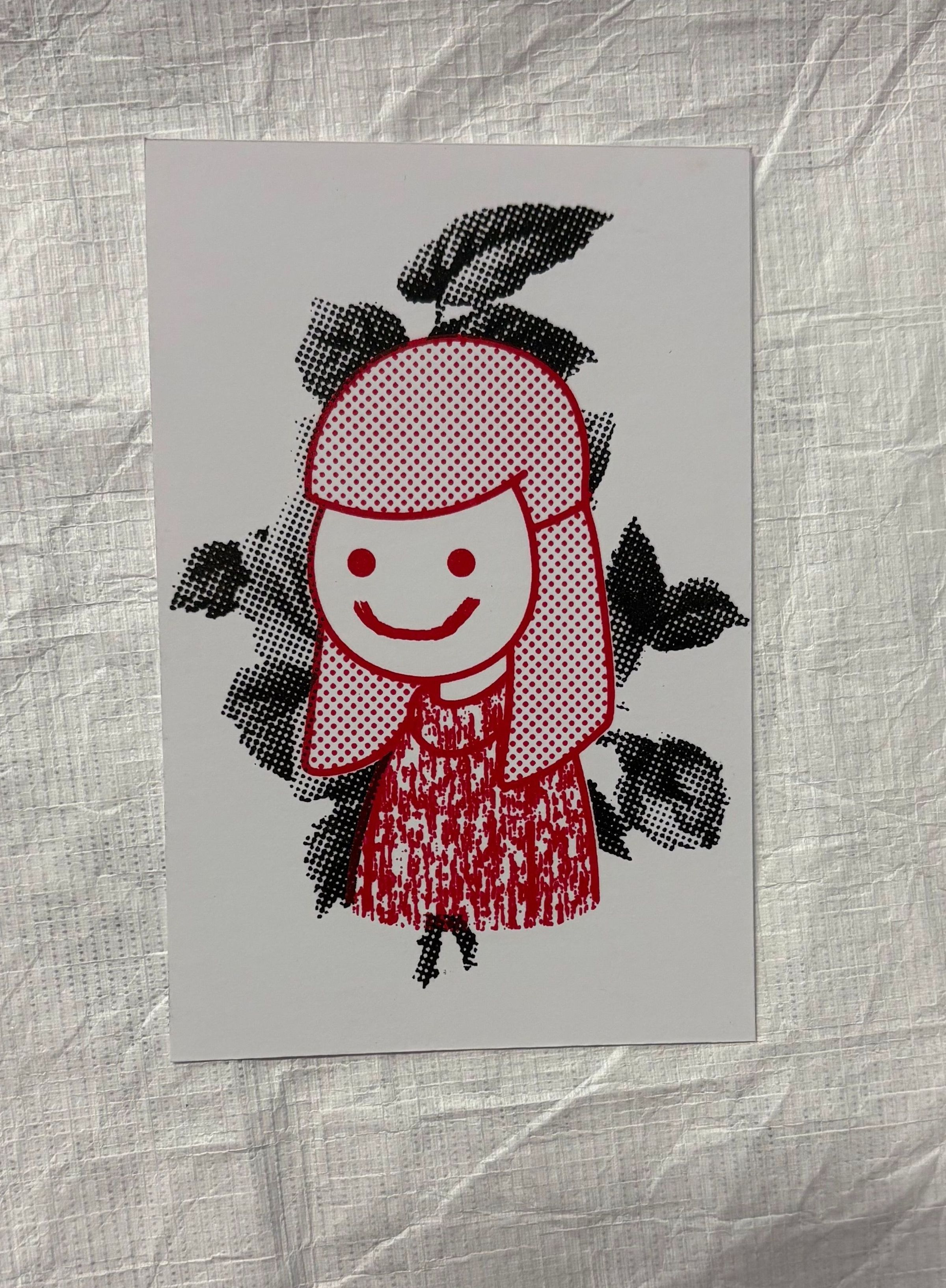 A small, vertically oriented print that is done on a white ground with red and black. At the center of the print is a figure with foliage like growth behind them. The print is constructed with a dot like application of color to create the forms depicted here.Collection