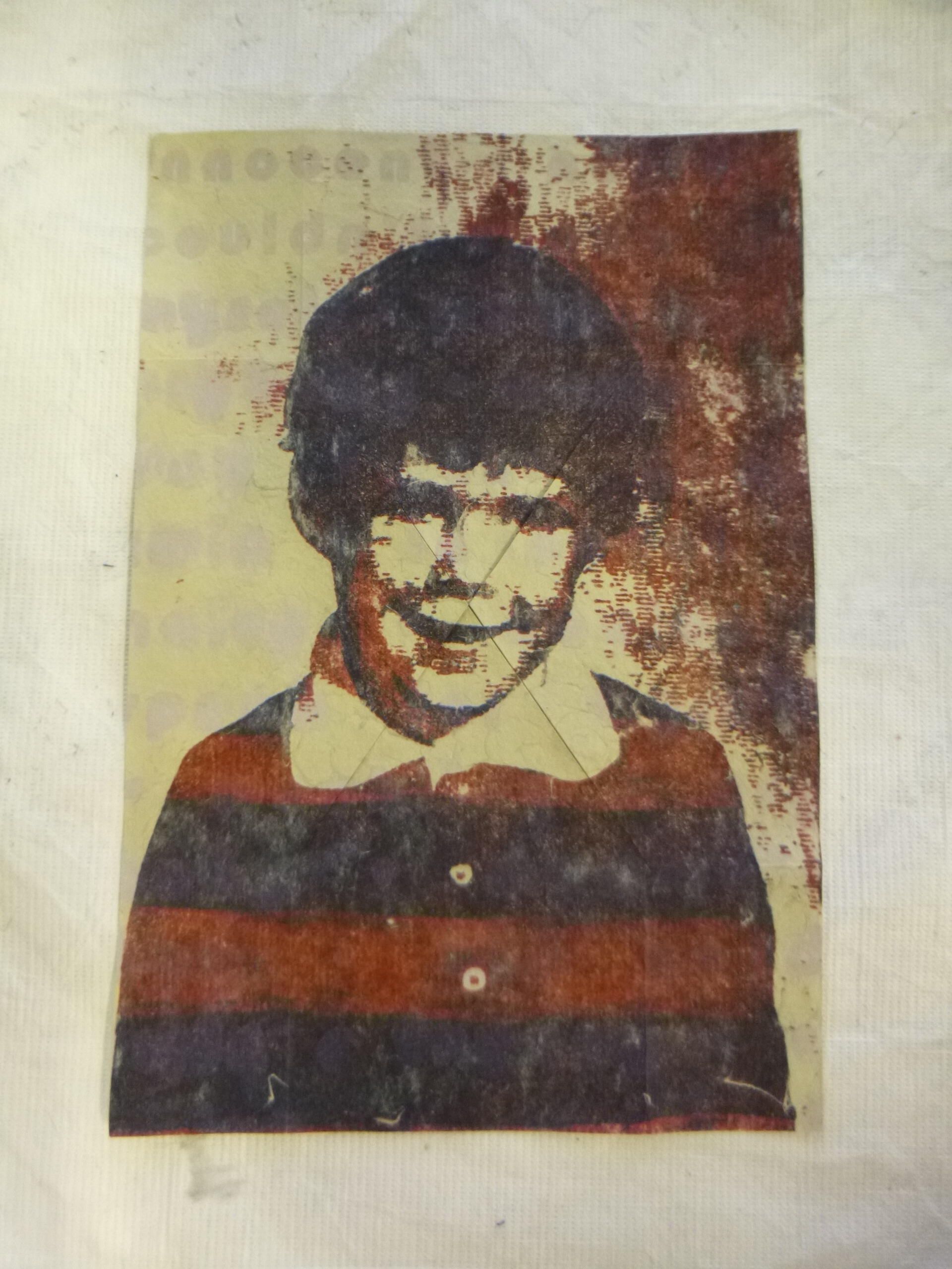 A small, vertically-oriented, double-sided print with the front side showing a young boy and the opposite side showing two halved portraits of a man. An X in the center of the print allows it to be folded over itself.Collection