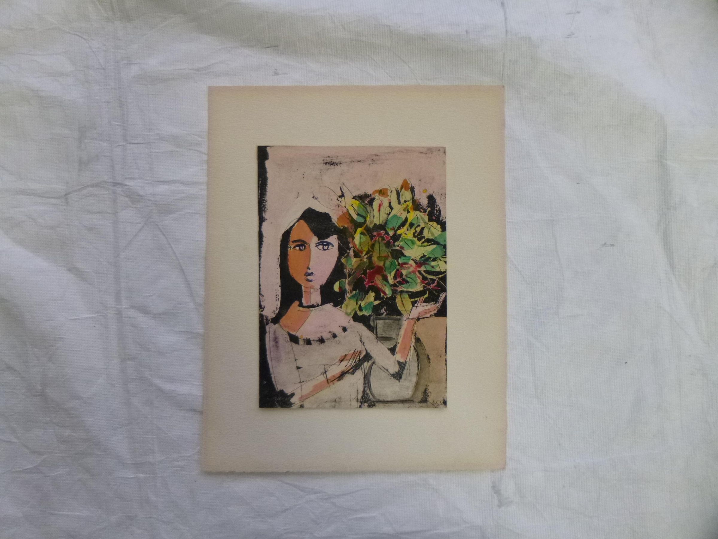 Small, vertically oriented print of a woman standing next to a potted plant and gesturing toward it with her hands.Collection