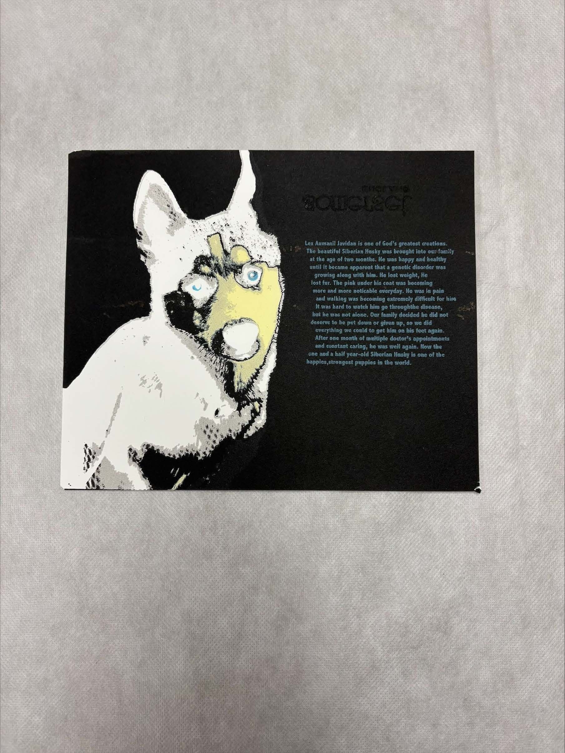 A horizontally oriented, medium sized print that utilizes the color tones of black, white, blue, yellow and grey to create its composition. The print shows a color inverted image of a dog on the proper right side, with text on the left side of the dog detailing a condition that the dog had.Collection