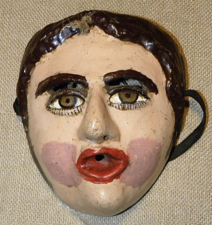 A life-sized triangular wood mask depicting a figure with a natural beige complexion and rose-pink blush circles. Short chocolate-brown hair. Painted brown oval eyes outlined with short eyelashes. Cutout eyeholes for the wearer are under the brown eyebrows. A droopy nose is above an open mouth in the shape of a circle. A circle is cut into the mouth. A thick wire, string, and band are attached to the back of the mask. Overall chipping and paint loss.Context