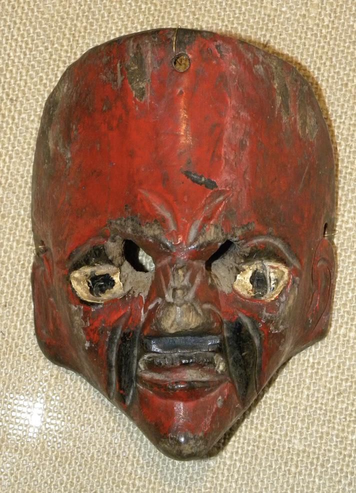 A small teardrop-shaped wood mask depicting a figure with a crimson-red complexion and a large forehead. There are wideset carved eyes and two cutout eyeholes for the wearer. A short, straight nose has a carved spider detail. Under the nose is a drooping black mustache and an open mouth. The chin is short and narrow. A wire is attached to the back of the mask. There is a large gouge on the bottom and overall signs of paint loss.Context