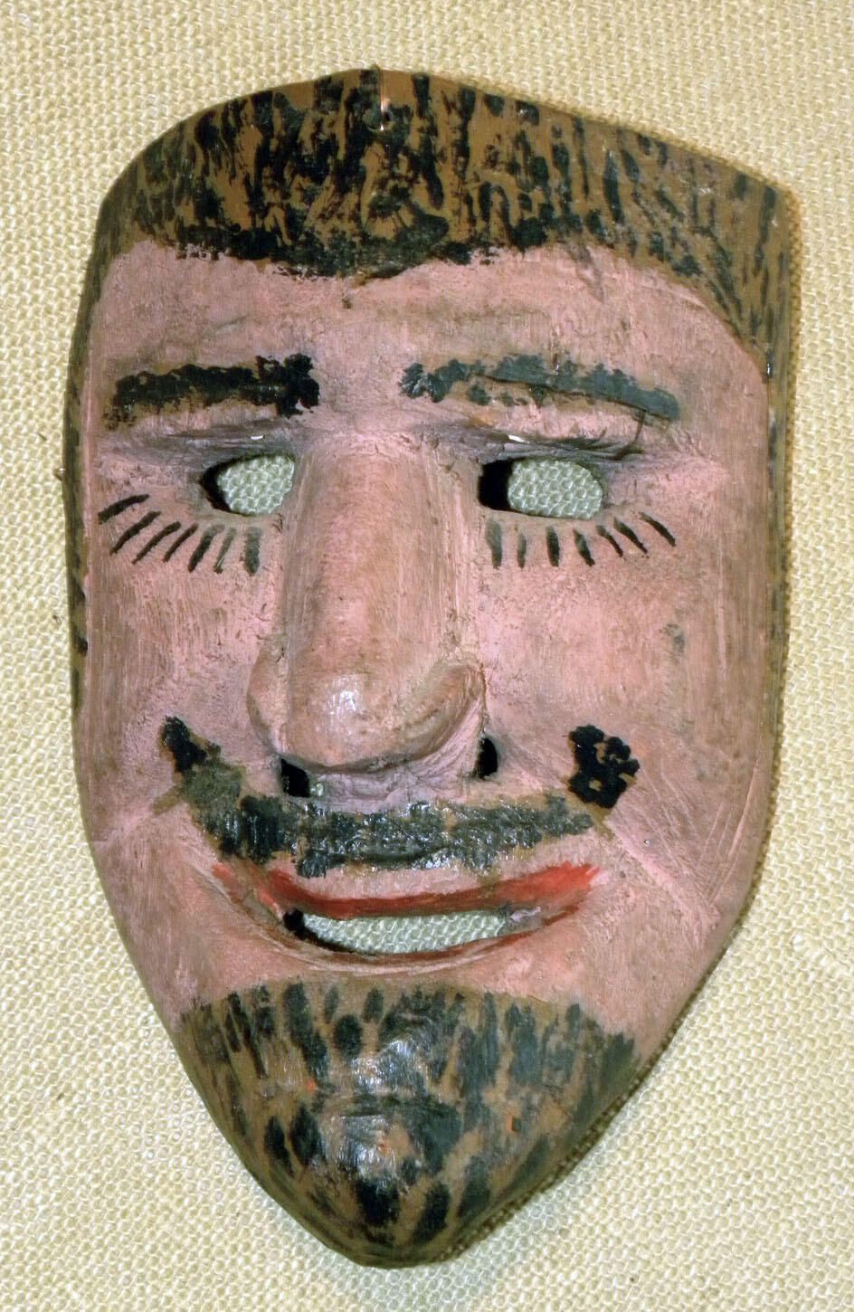 A life-sized oval wood mask depicting a man with a crepe pink complexion. Two painted black eyebrows over cutout eyeholes with black painted lashes. A hooked nose with two cutout nostrils is above a painted, upturned black mustache. The mouth is cut out and lined with red lips. The hair and beard are brown and detailed with black spots. A wire is attached to the back of the mask. Sign of paint loss.Context