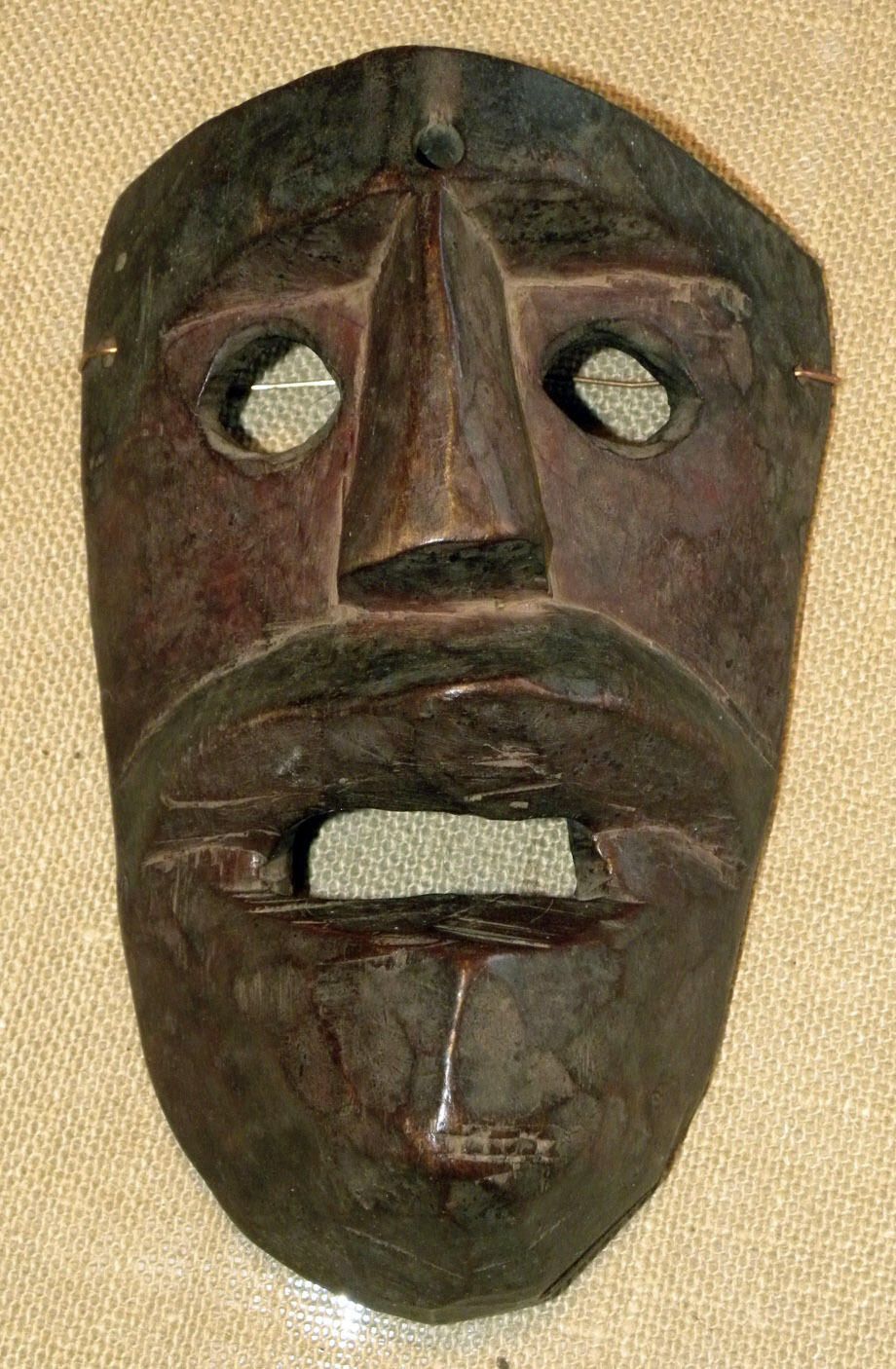 A life-sized rectangular wood mask depicting a human figure. Two cutout circular eyeholes on either side of a large, triangular nose. A cutout open mouth under a large, protruding lip area. A wire is attached to the back of the mask.Context
