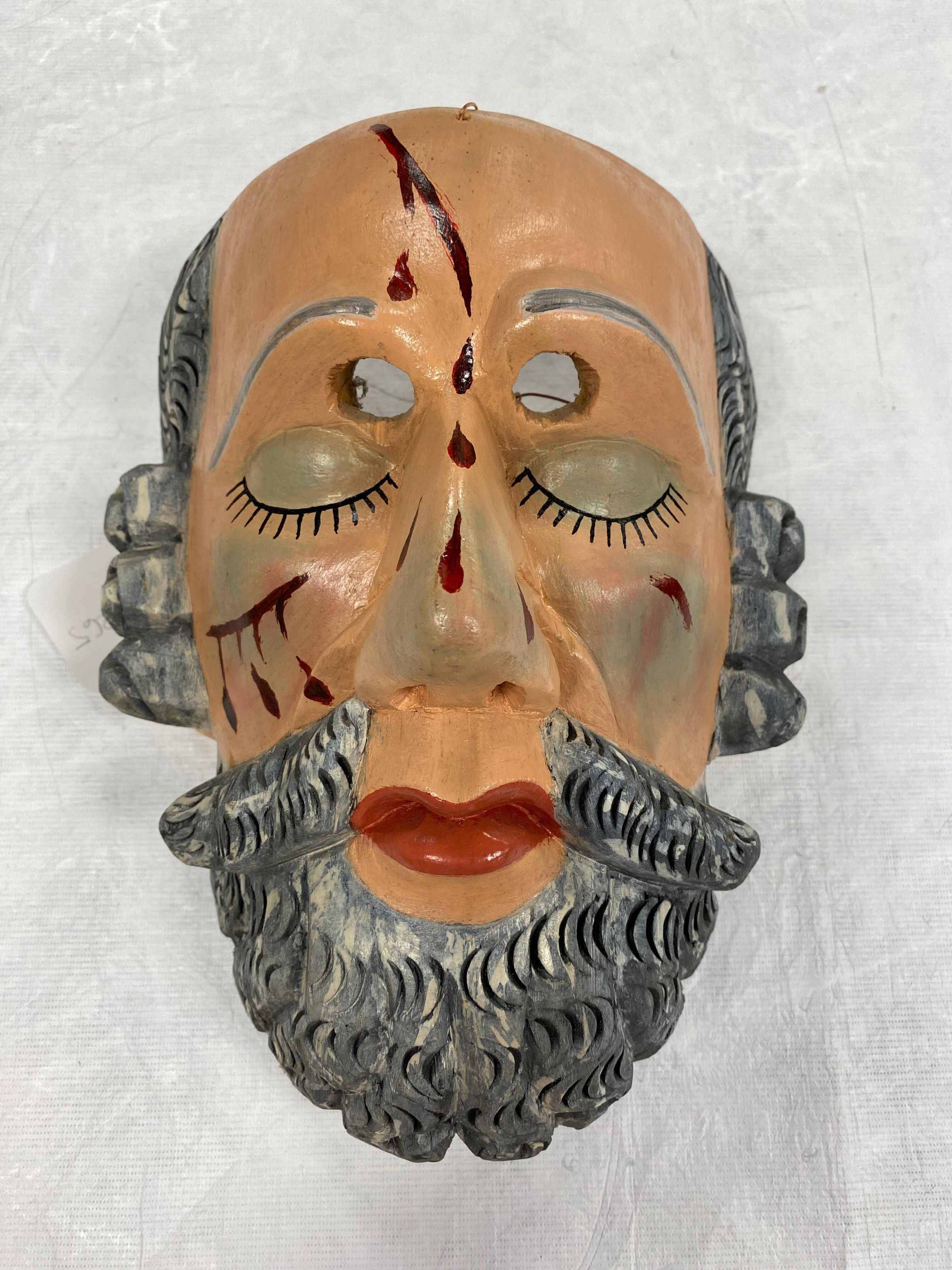 A long oval-shaped wood mask depicting an older man with ivory skin and grey accents on cheeks, nose, and eyelids. There is receding, wavy silver hair that leads to curled sideburns. There is also a parted silver mustache and beard. The eyes are closed and are lined with black eyelashes. The cutout eyeholes for the wearer are under thin grey eyebrows. The mouth is red and closed. Dark red bleeding slashes are painted on the cheeks and forehead. A copper wire is attached to the back. The mask is in excellent condition.Collection