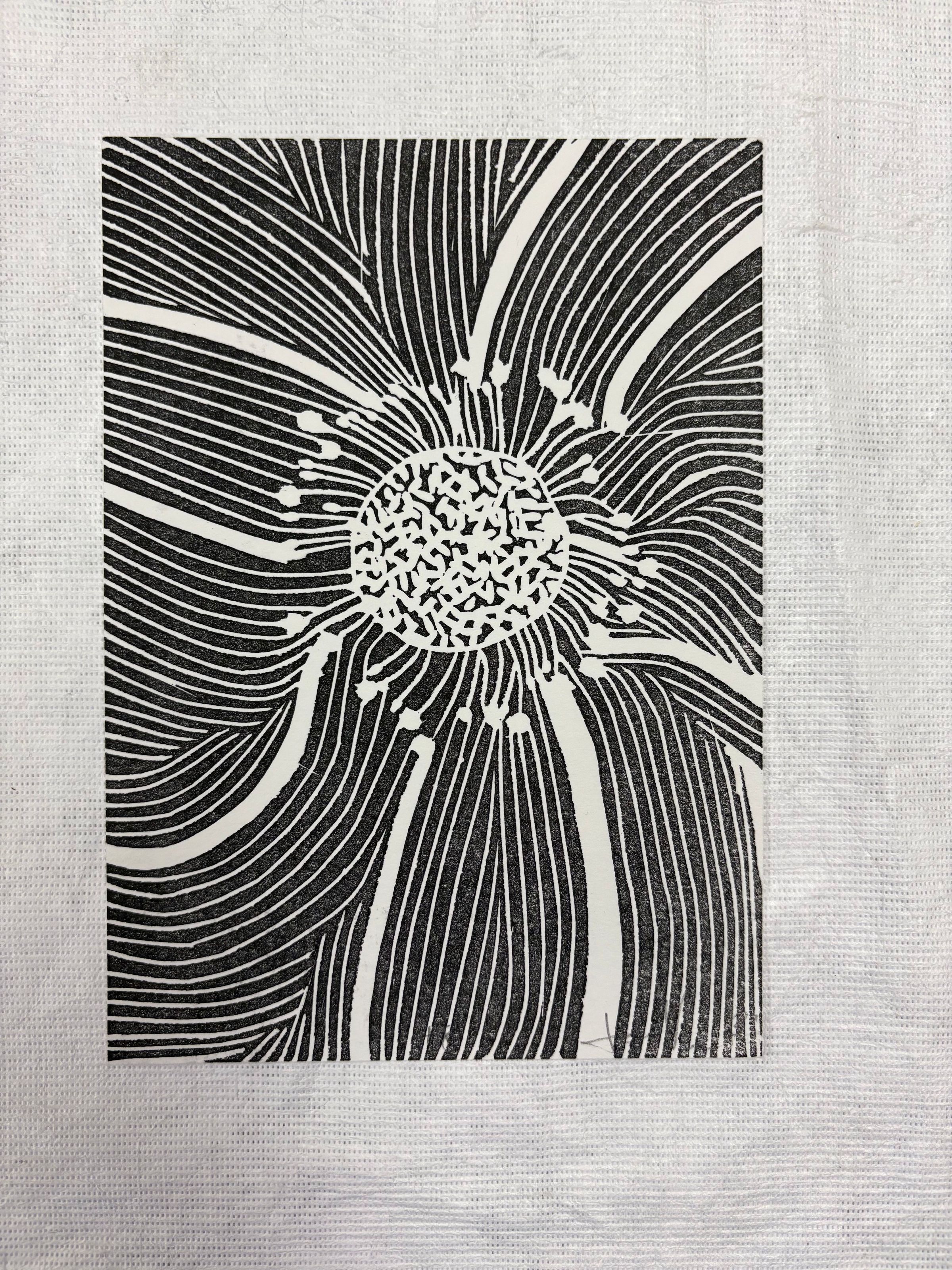 A small, vertically oriented print that is done on a white ground with black pigment. The entirety of the print is taken up by many curving lines that curve towards the center of the print. At the center of the print is a circular shape that mimics the center of a flower.Collection