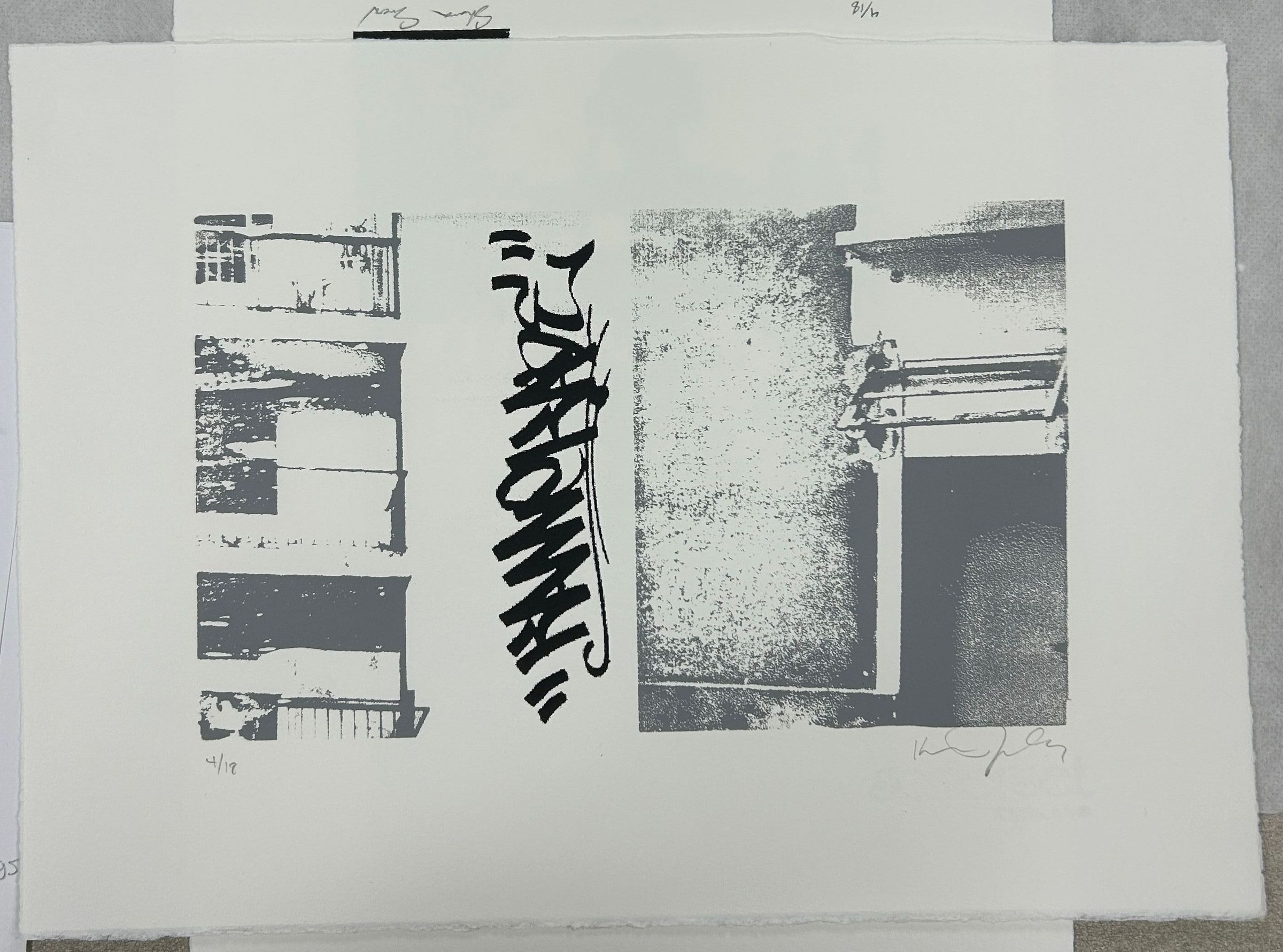 Average-sized print on cardstock of tall buildings with graffiti on the wall.Collection