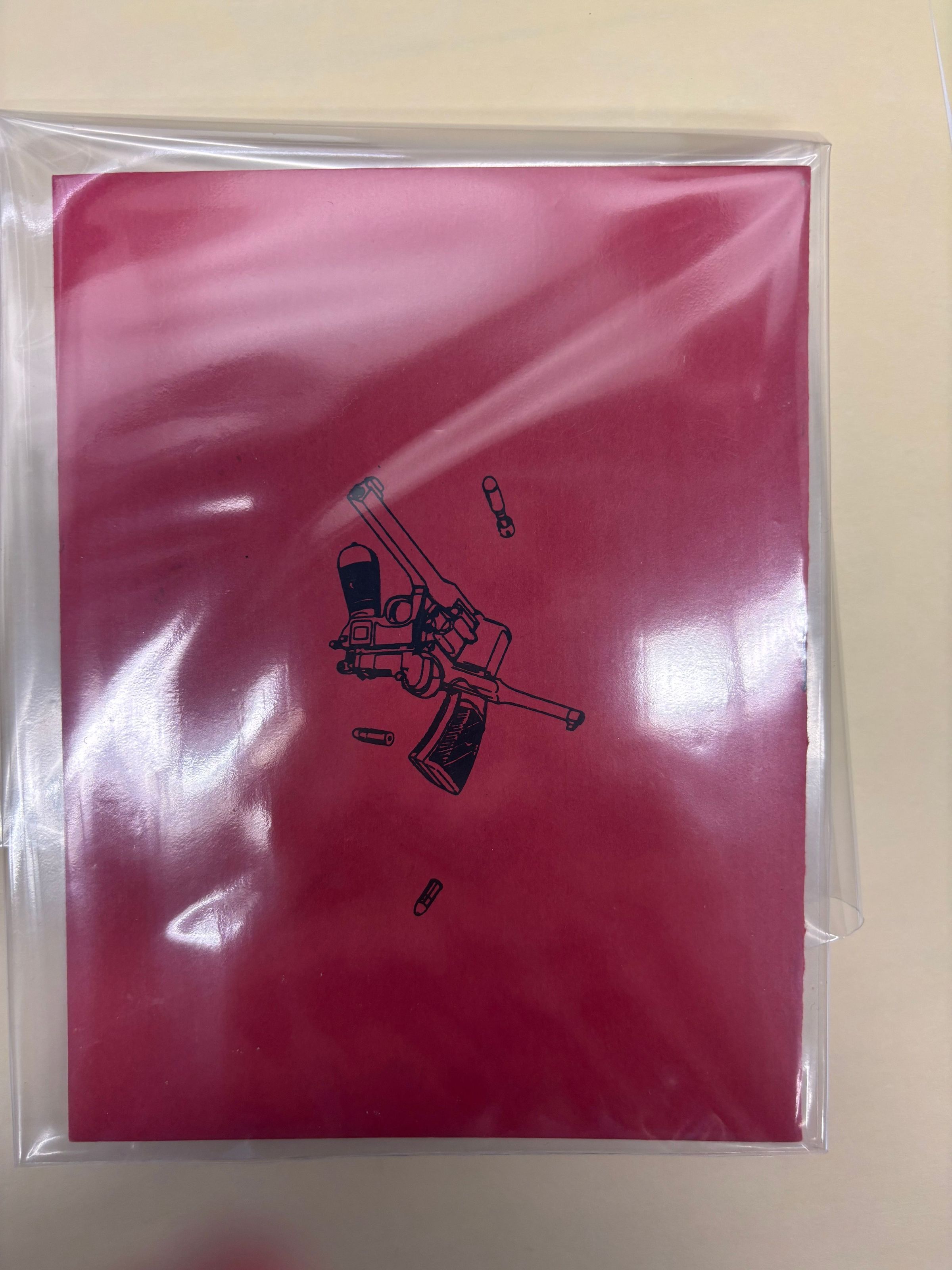The book has a red cover with white paper for the interior pages. There is a printed vampire bat on the front with two pistols on the back with bullets.Collection