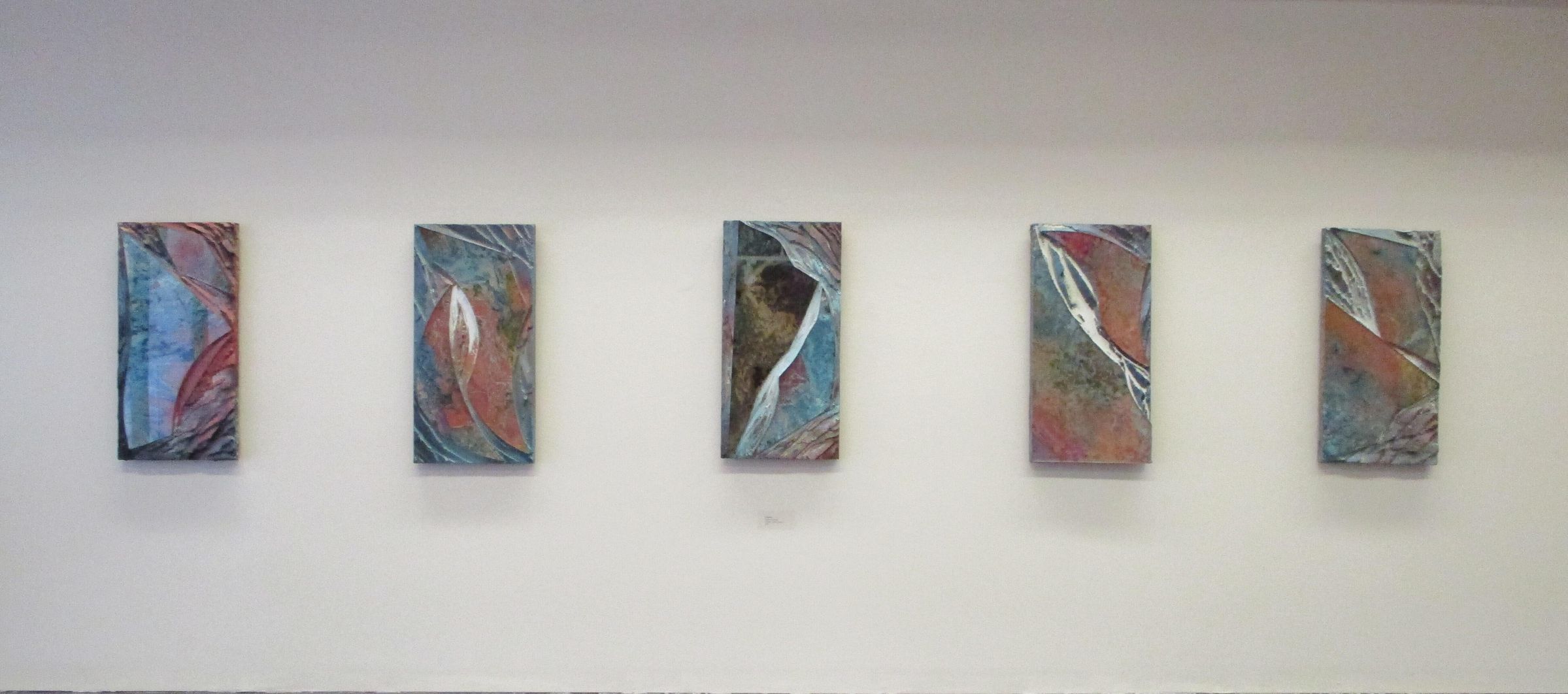 Wall-hanging wood panels decorated with mixed media; glass over oxide encased with cement that appear to mimic natural red oxides from corrosion. Artwork has been treated to appear as if it has patina.Collection