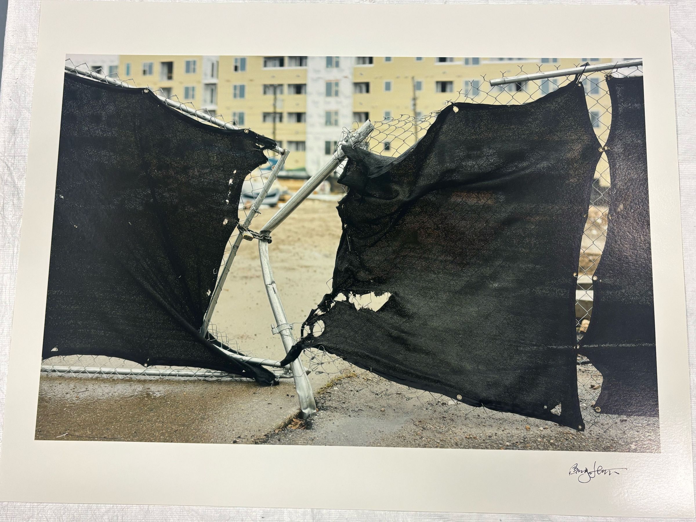 Large, rectangular, horizontally- oriented print of an image depicting a fence covered in black tarp with holes. The poles of the fence are bent inwardly held together by a lock and chain. The background features a yellow building.Collection