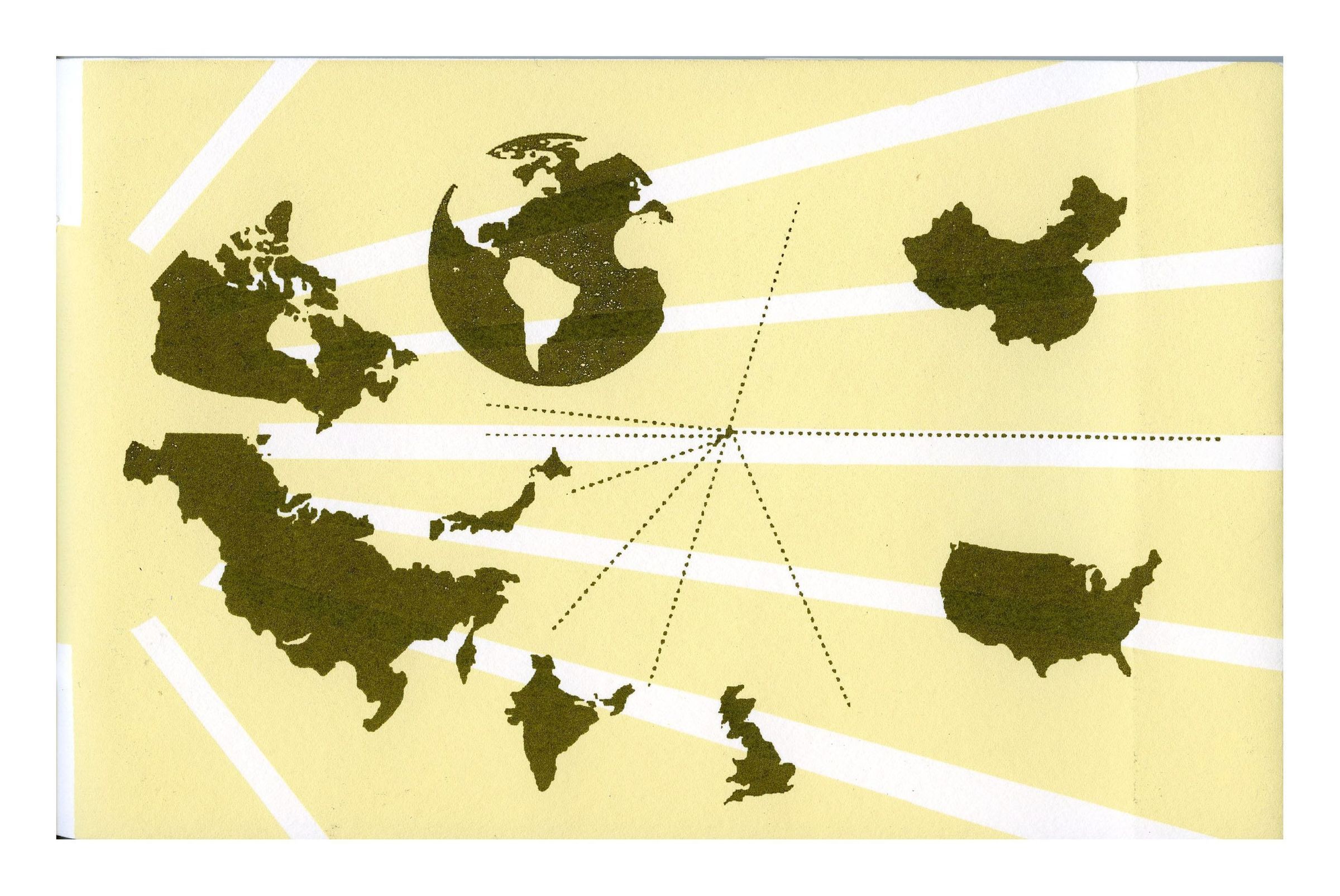 Small horizontal-oriented paper booklet with a pale yellow and white striped cover, creating the illusion of a sunburst on the left side. Black printed countries and world globe shapes are located across the page with a series of dotted lines in the center.Collection
