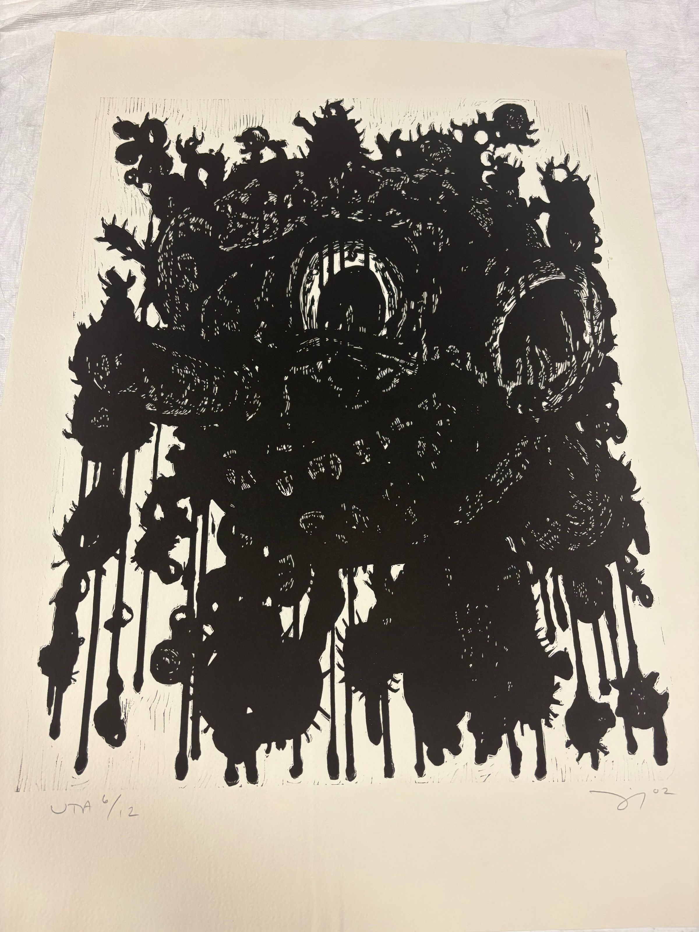 Large, rectangular, vertically oriented image depicting a black dripping blob-like figure with two big eyes with lots of textures.Collection