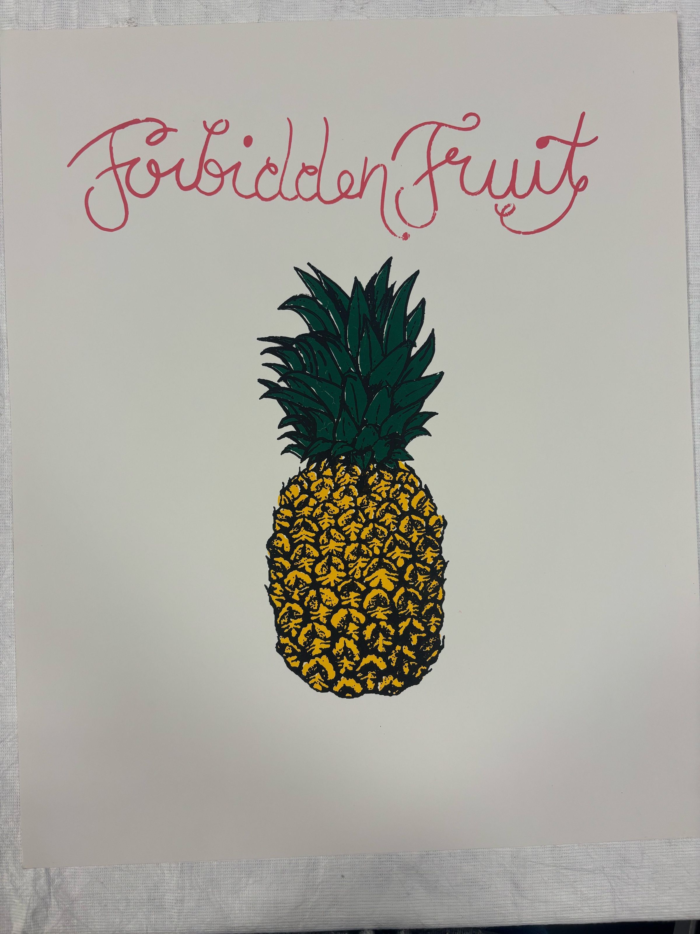 Medium, rectangular, vertically-oriented print depicting a pineapple in yellow with a green top. Large pint cursive letter creates the title "Forbidden Fruit" above the pineapple.Collection