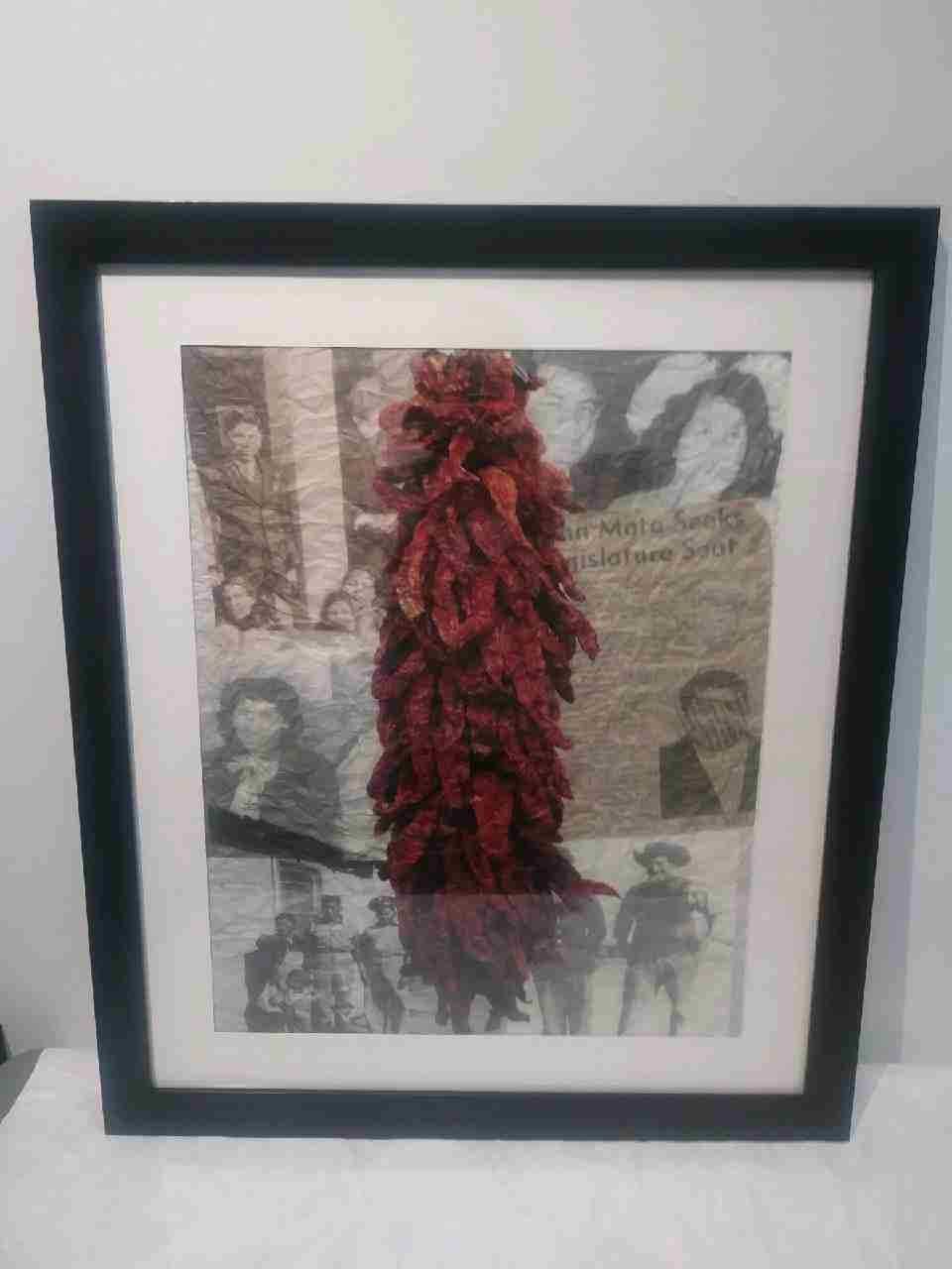 A digital composite/collage of different photographs of individuals both male and female, with a photo realistic image of a "ristra" of a string of chili peppers all hanging together.Collection