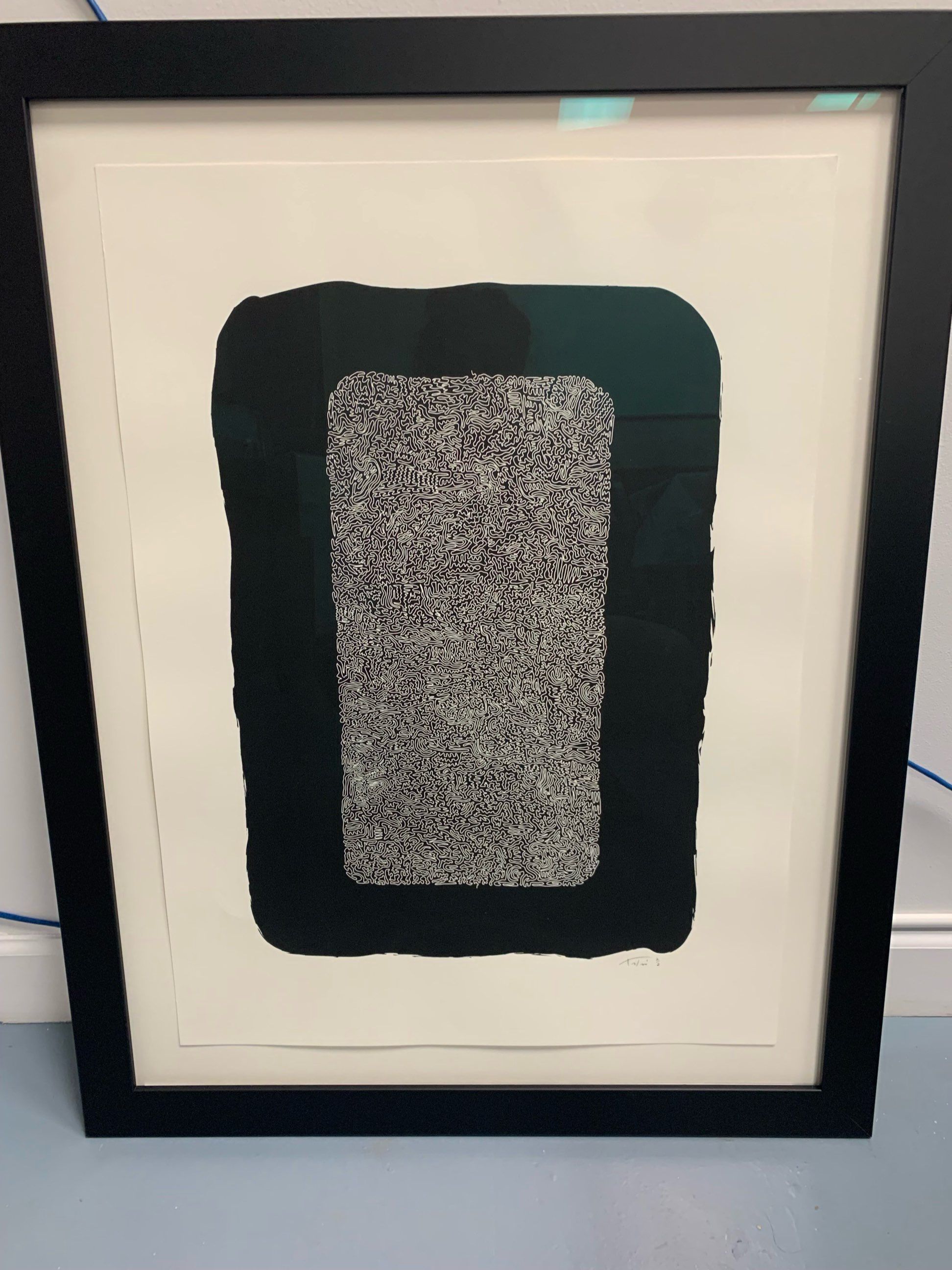 A medium-sized, vertically oriented, black and white print of a black marking centered with multiple wavy lines connected together inside of it.Collection