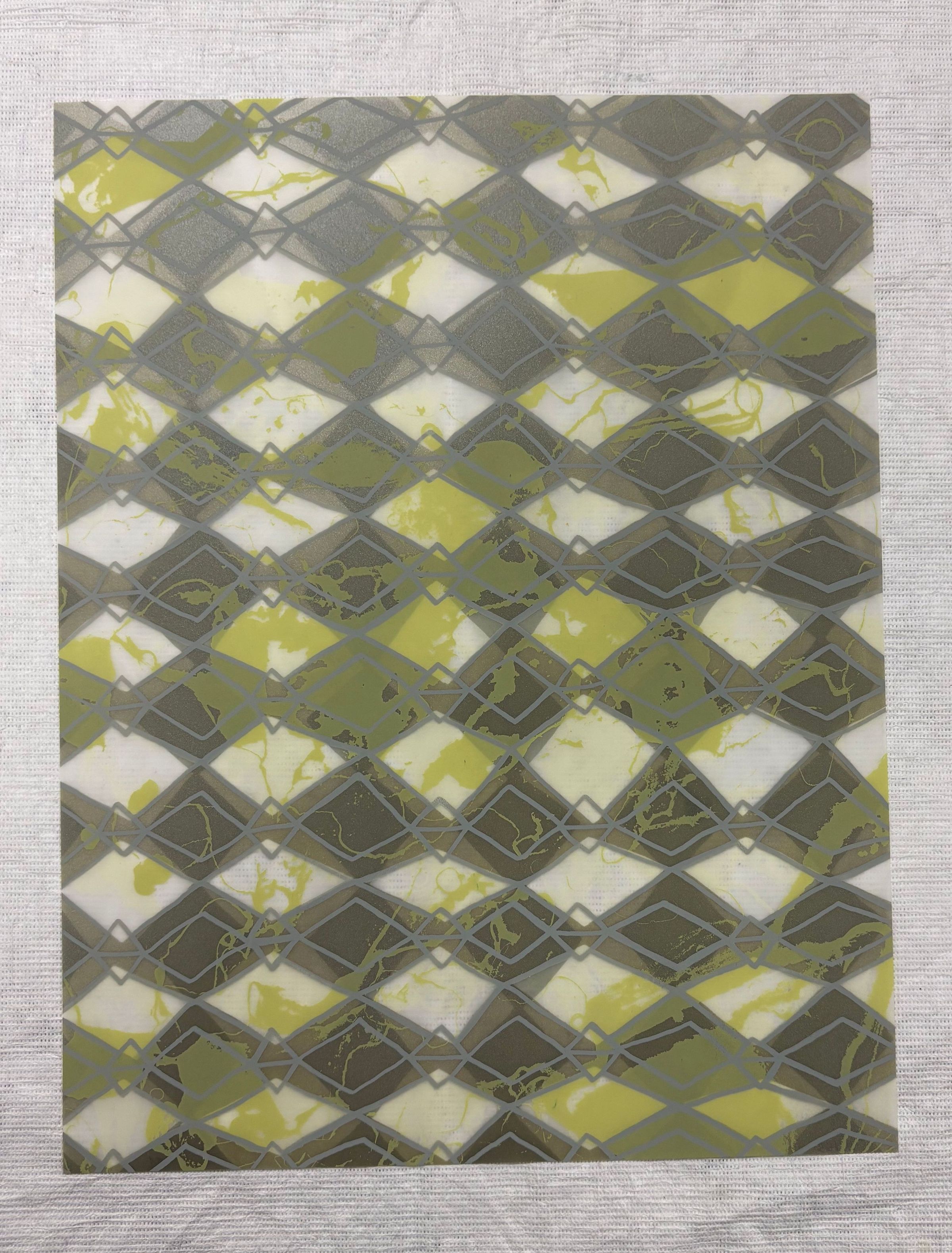 A vertical print done on transparent letter sized paper with multiple layers. The work is abstract in its use of various shapes and splatters.Collection