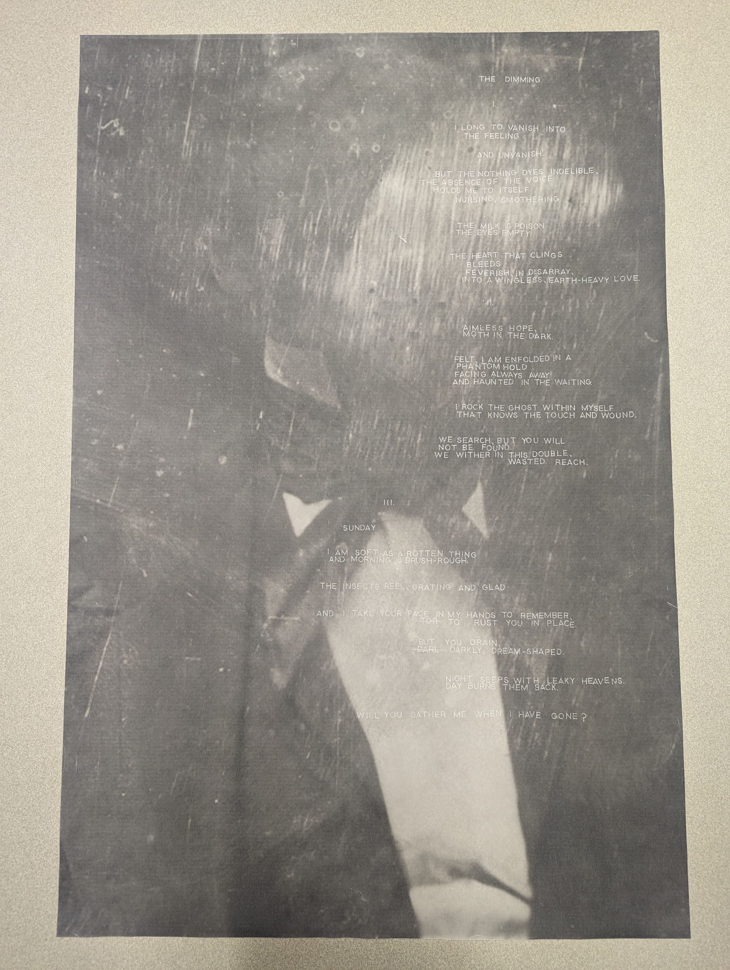 An extra large vertically-oriented print in tones of grey and white, depicting a portrait of someone in a suit and bowtie with their face blurred by scratchy/foggy obfuscation that lays across the whole print. A poem runs down the paper, titled "The Dimming," the font rendered by dots of white pigment and minuscule punched holes that give it a textured feeling.Context