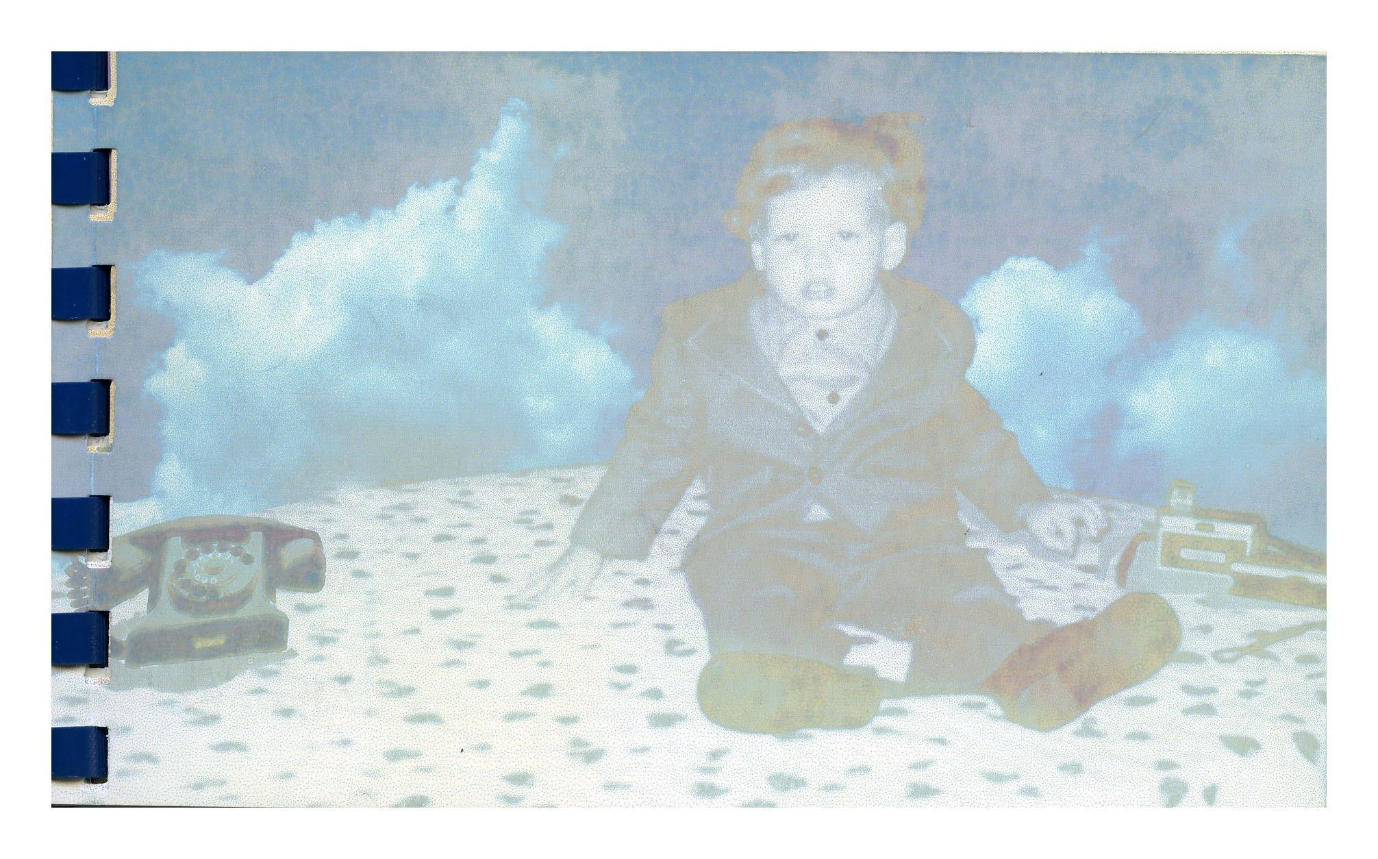 Small horizontal-oriented paper booklet with a faded photograph on the cover of a toddler in a suit (located on the right side) sitting atop a patterned blanket in front of a blue sky backdrop. Next to the toddler on the right is an old device (perhaps a camera) and to the far left is a rotating dial telephone.Collection