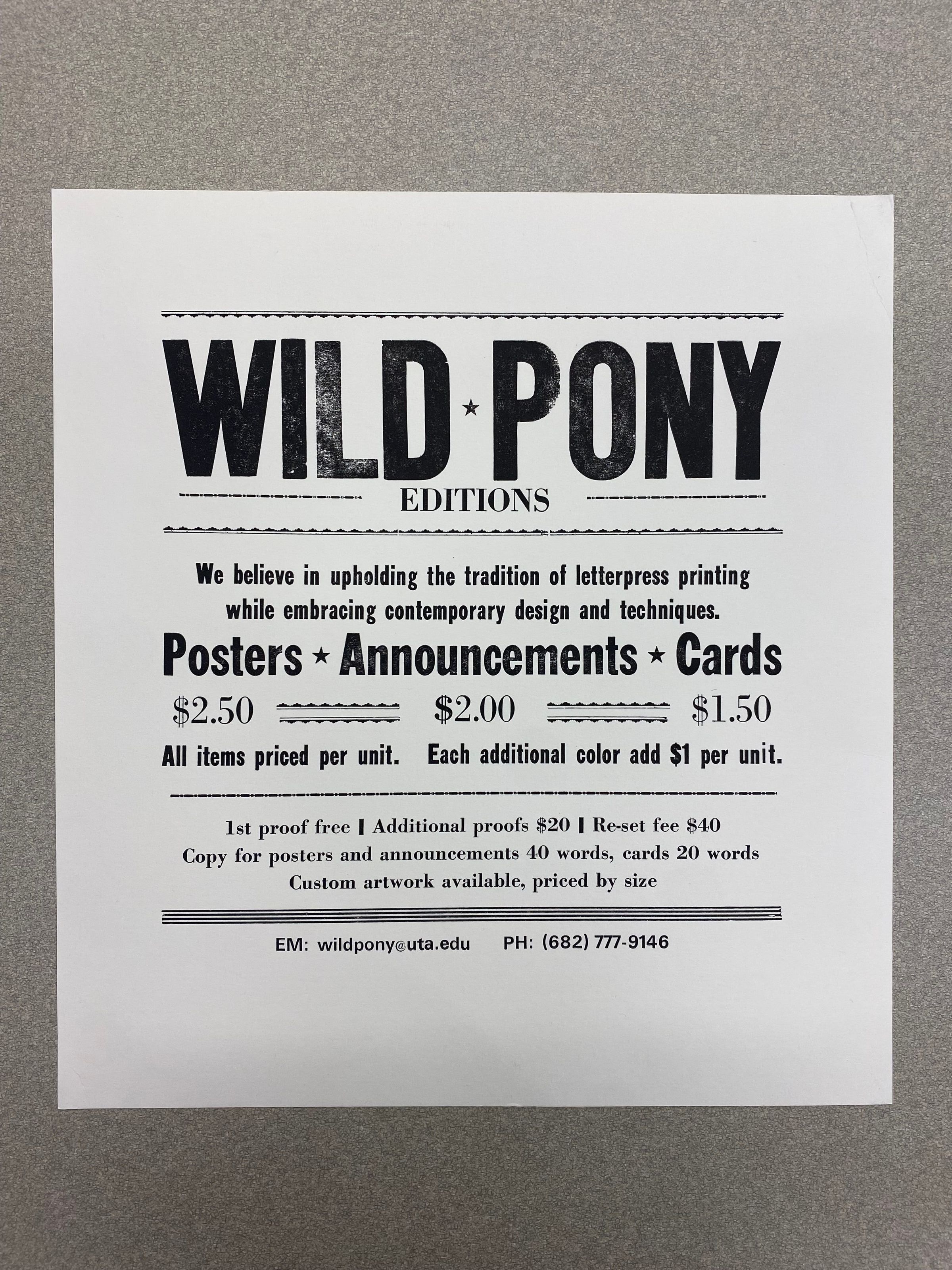 A small vertically oriented print displaying an advertisement for the University of Texas at Arlington's Wild Pony printing press. The print is organized neatly with horizontal dividers marking each section of text, which possess small ornate designs. The prices for posters, announcements, and cards are listed in the middle of the print is bolden.Collection