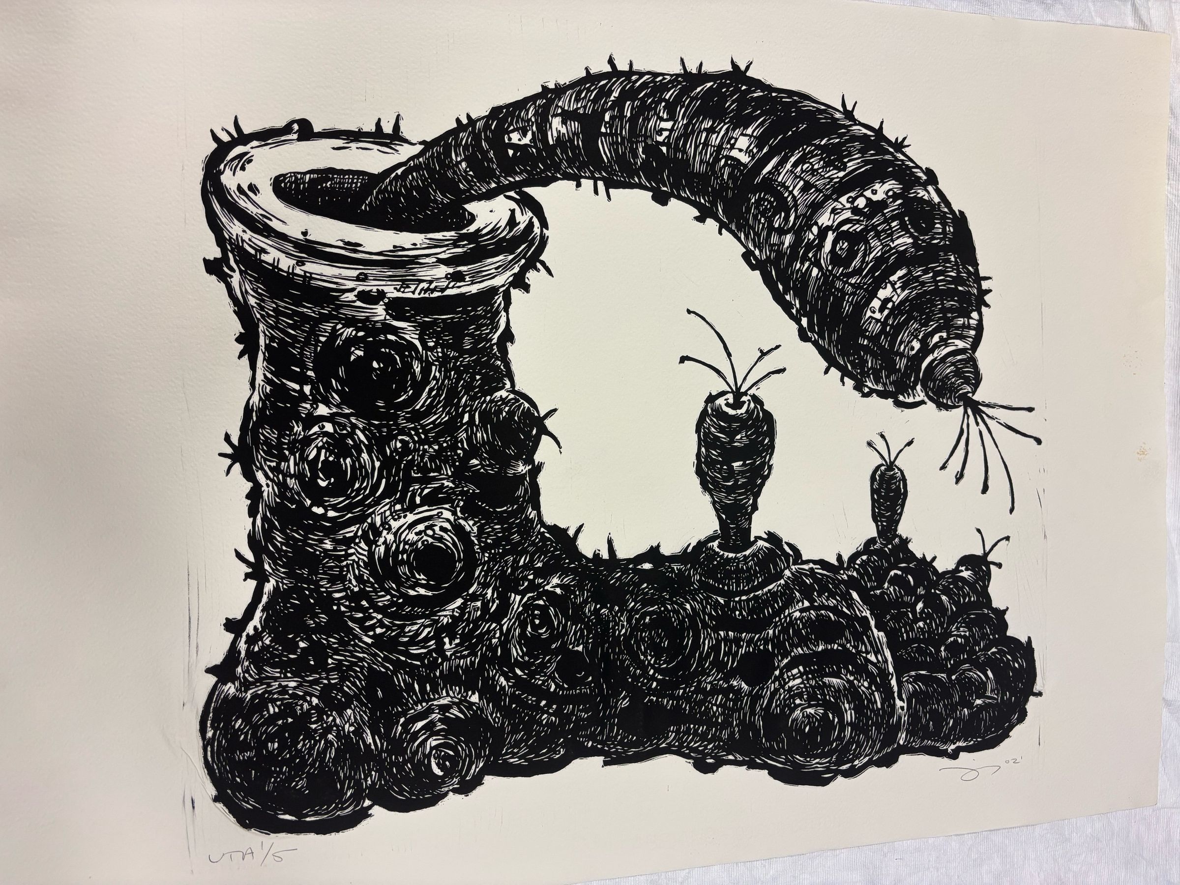 Large, rectangular, horizontally-oriented relief print depicting a sock or foot covered with bulbous spots that spurt. A worm is coming out from the top of the sock also spurting out lines at the end.Collection