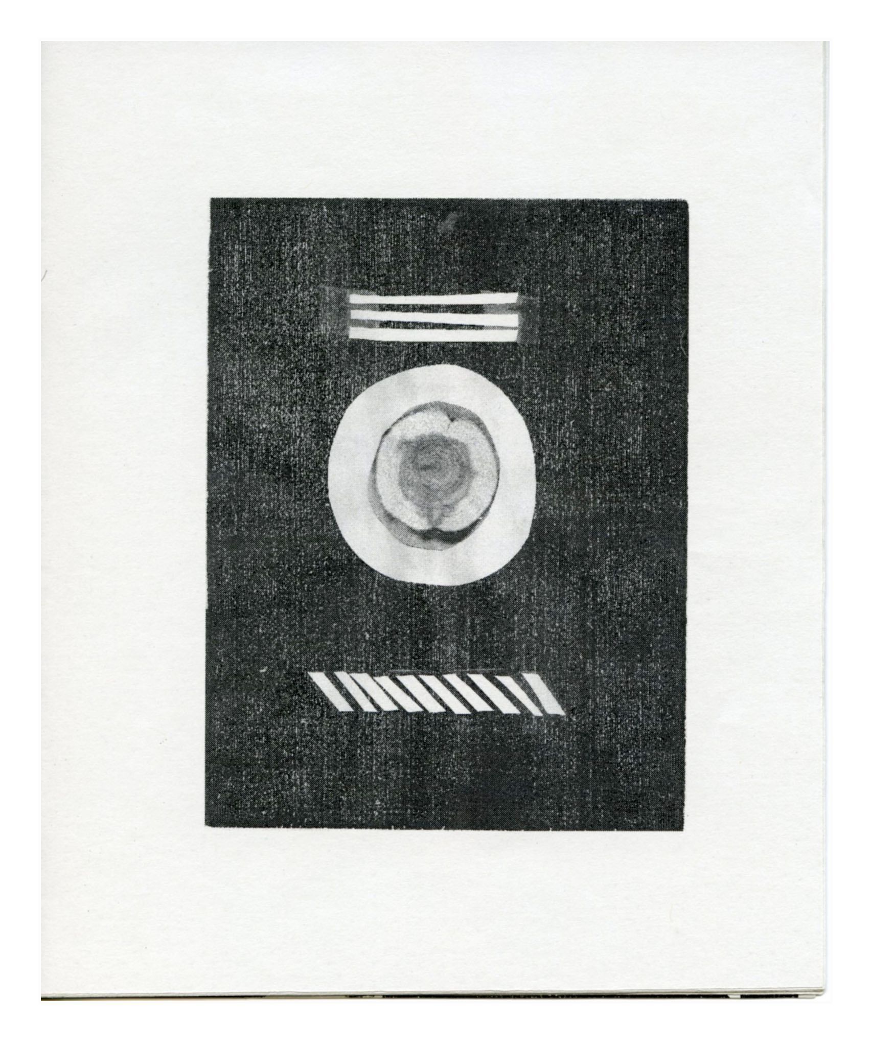 Gray paper booklet with black print. Black square in center of page has a circular figure in the center with 3 horizontal line above it and a series of diagonal lines underneath.Collection