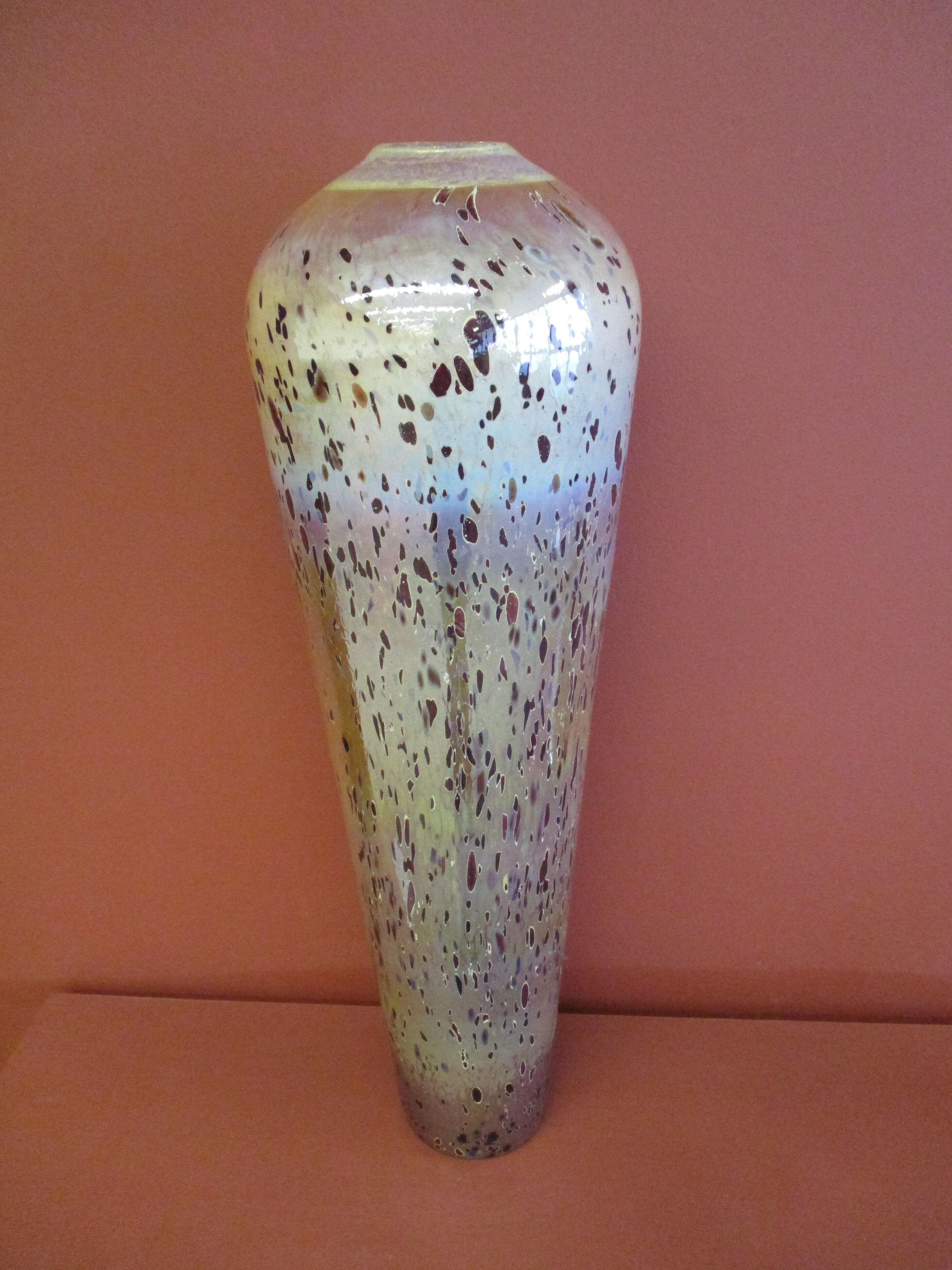 Tall orange blown glass vase, decorated with dark red speckled spots. The color darkens as it reaches the bottom of the vase, and the overall vessel has a holographic sheen to it.Collection
