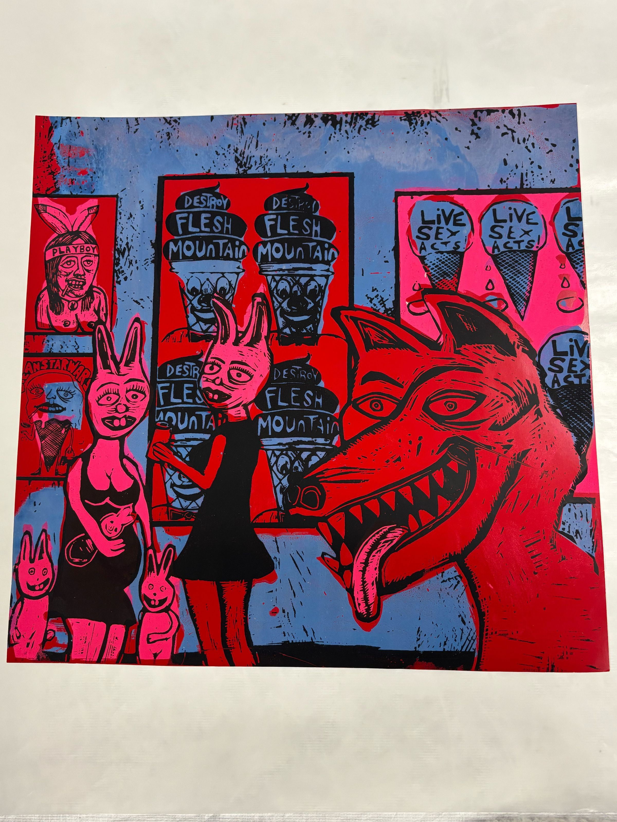 Medium, square, vertically oriented print featuring a dog with its tongue out. Next to it are women and children figures with rabbit heads. In the background there are posters of ice creams with statements.Collection