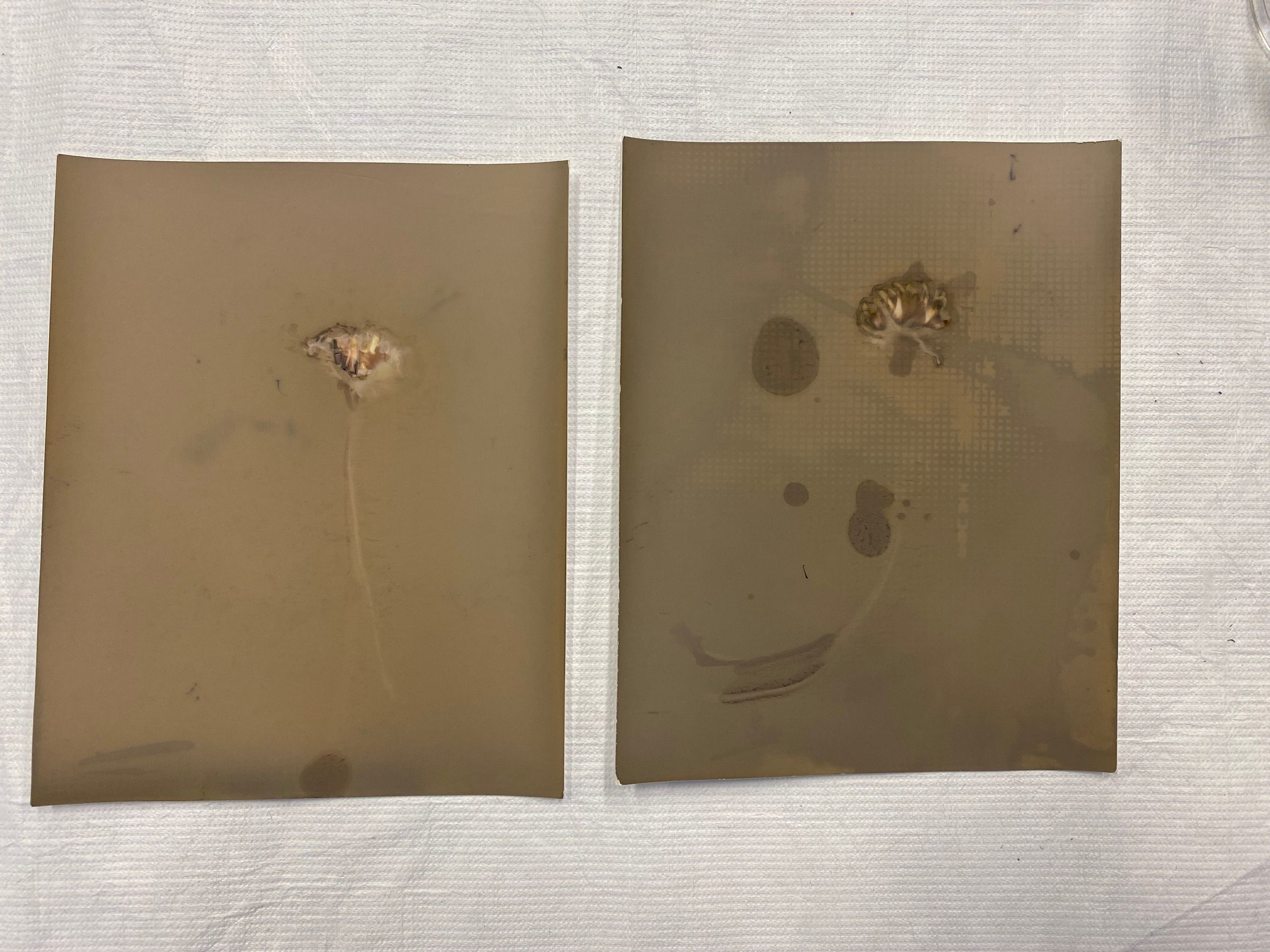Two small horizontally oriented photographs that have been altered to incorporate plant matter. Both utilize centrally placed floral forms against the tan or brown background of the photo print.Collection