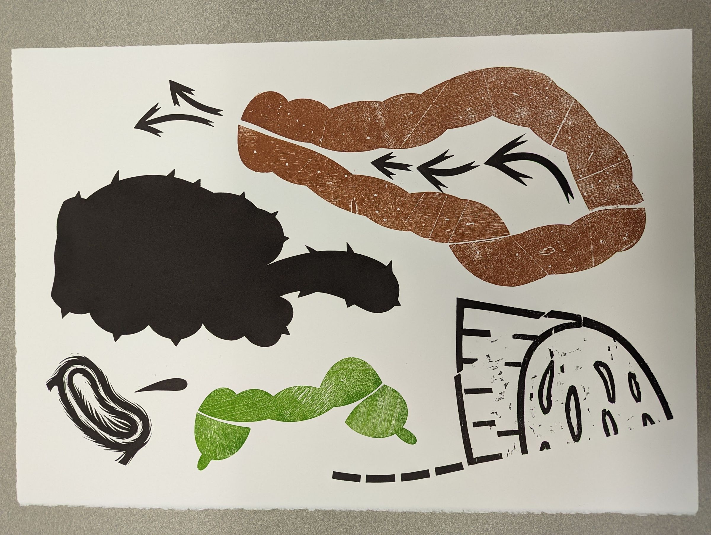 A large horizontal print with several organic shapes arranged on the page; a brown enclosure with arrows pointing out, a prickly shape with a protrusion, a teardrop coming out of a furred tube, a droopy green shape, and half of a spotted cylinder.Context