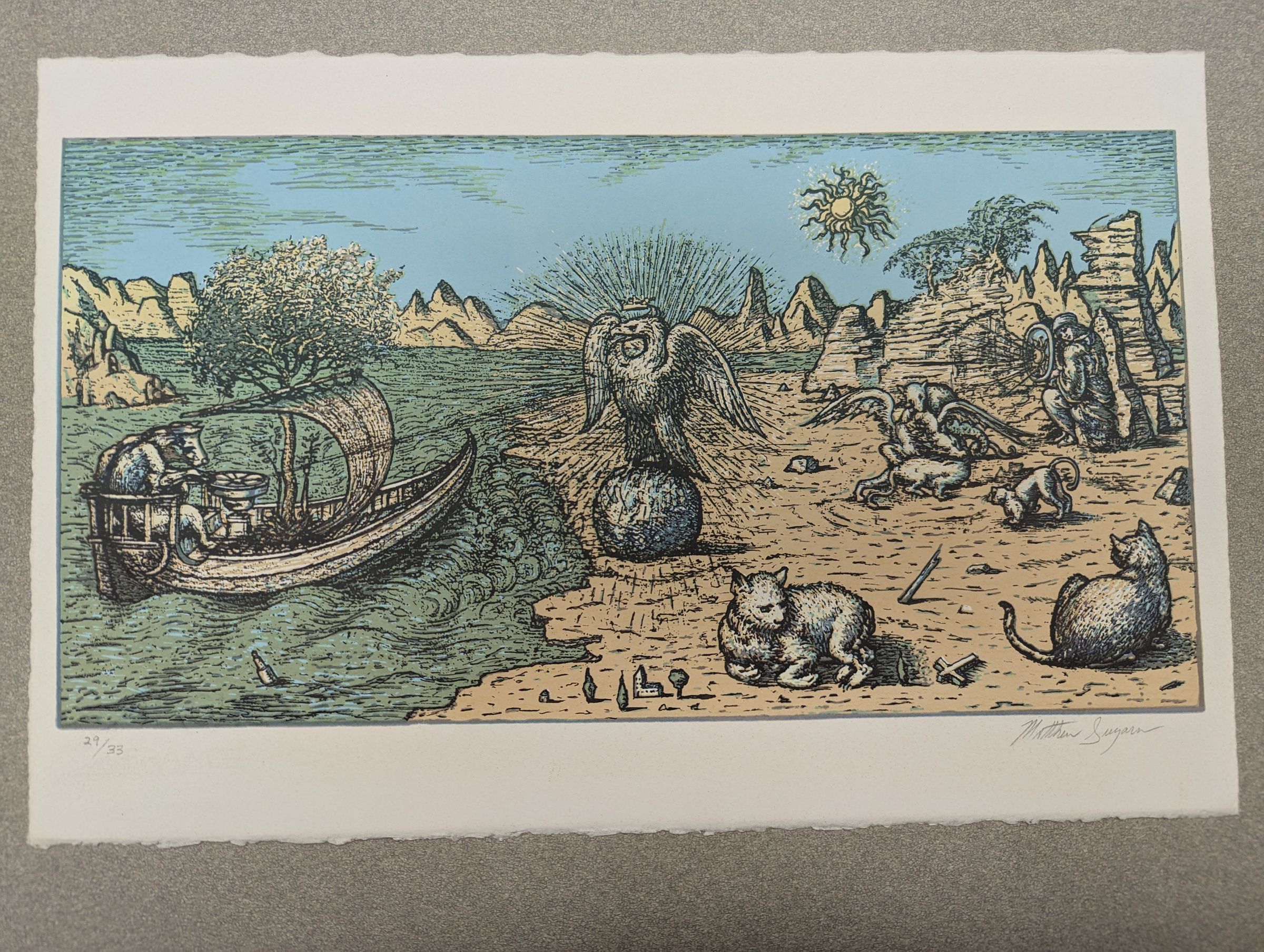An abstract land/seascape populated by animals and a person (a dog sitting in a tree-boat, an eagle standing on a globe, cats resting or hunting, etc).Collection