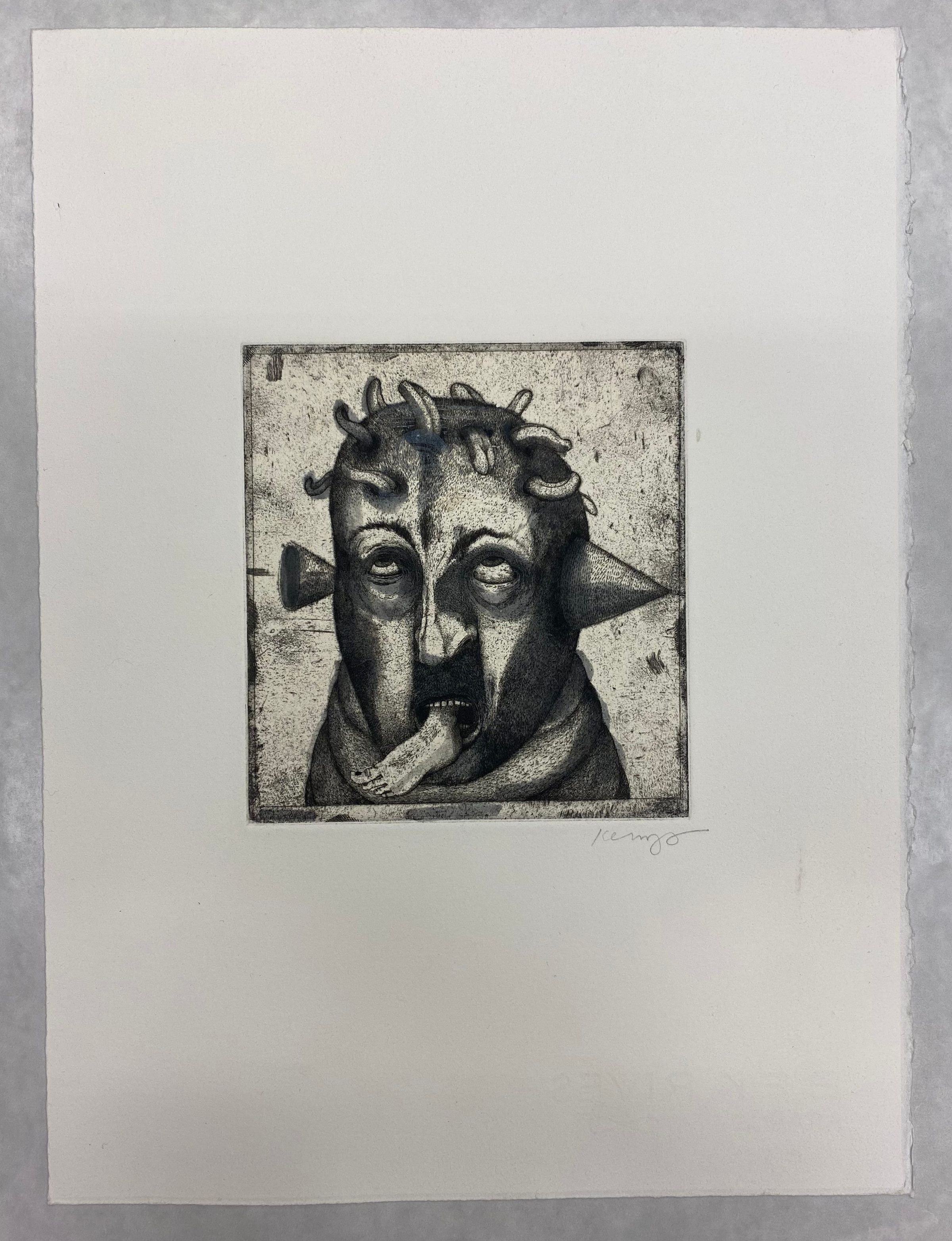 A small-medium vertically oriented print depicts a human-like head with tongues coming out from their head and and a foot coming out of the mouth. There is also a form, much resembling a nail, protruding from both sides of the figure's head going into the left ear and shooting to the right ear.Collection