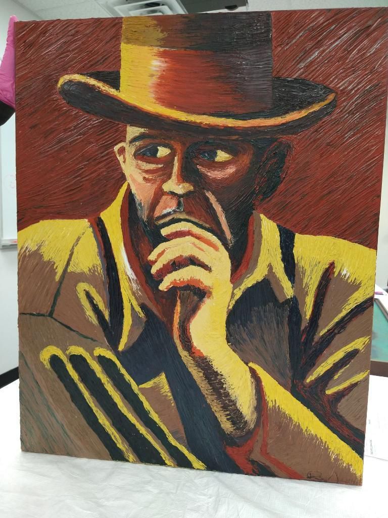 A medium sized painting of a man dressed in a suit with a top hat looking to the right with his left hand resting on his chin.Context
