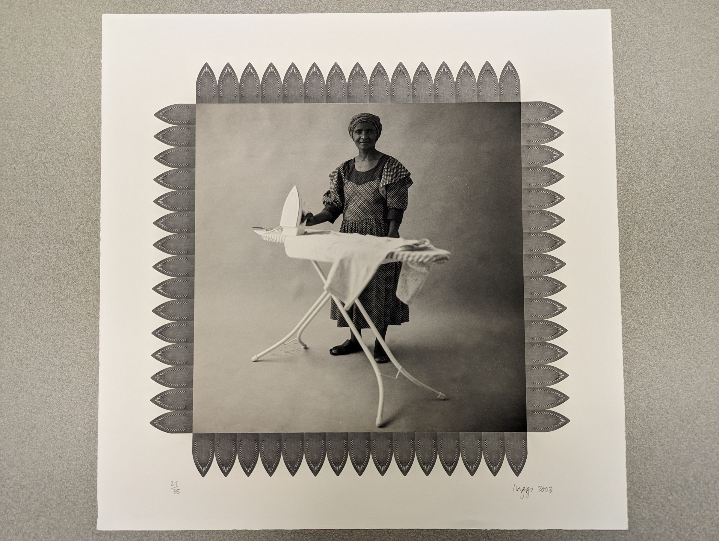 A black and white photograph of an old dark-skinned woman wearing a dress and headscarf and holding an iron on an ironing board with a white shirt on it. The photograph is bordered with a pattern of embossed/beaded triangular shapes going along each of the four sides.Context