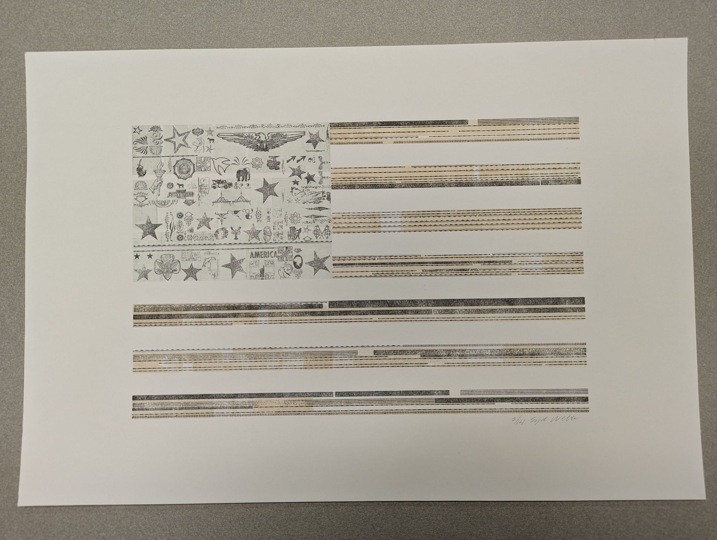 A horizontal print of a design in the shape of the American flag. The stripes are alternating white and then black/yellow patterns, and the top left corner is a gray field on which are printed various different designs of stars and American emblems like the torch of liberty or the bald eagle.Context