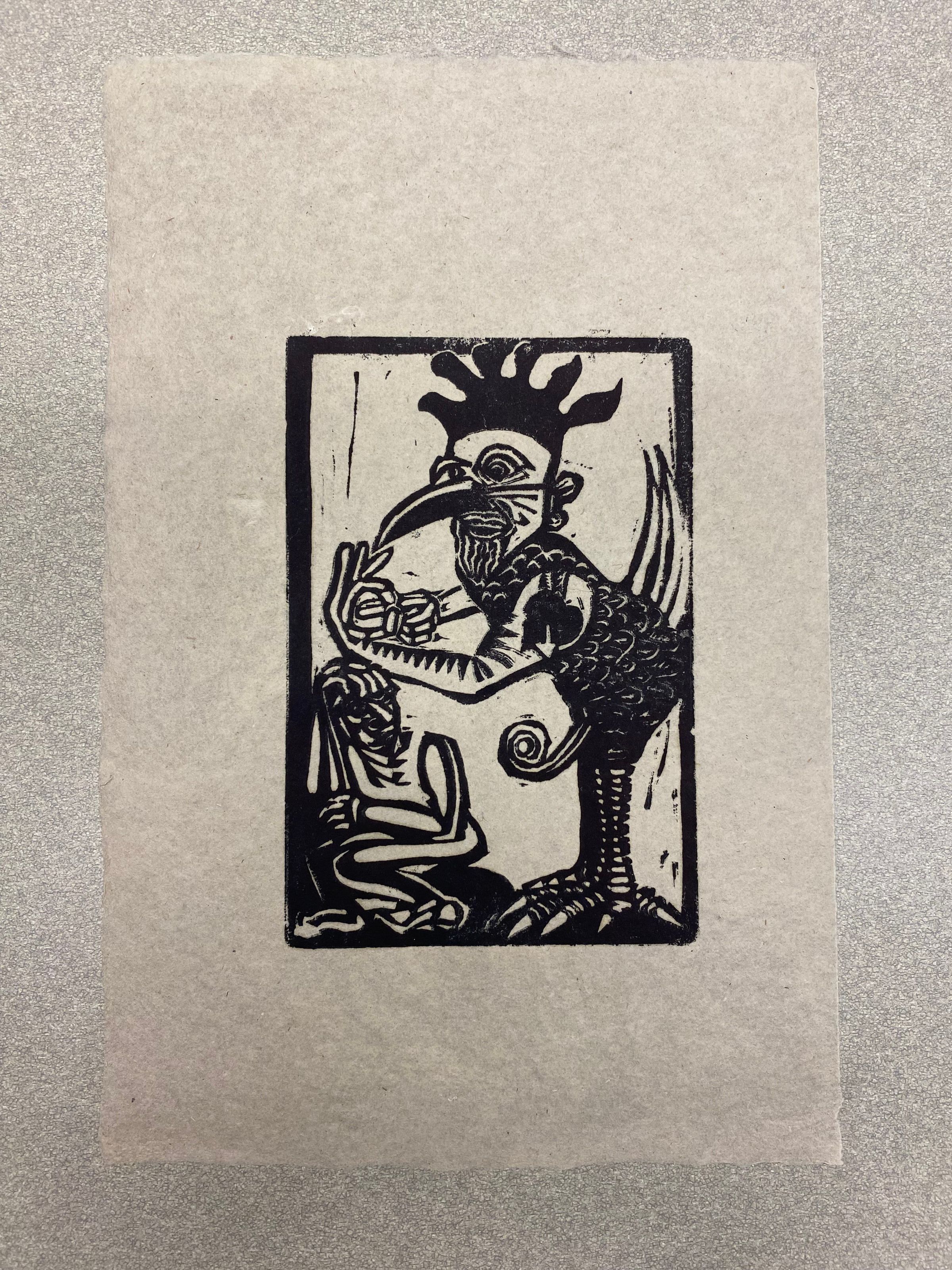 A small vertically oriented print of two figures inclosed within a rectangular shape. The larger figure on the right possesses both human and rooster features making a sexual suggestive gesture toward the figure to the right, while having a swirling phallic shape between their legs. The figure to the right is smaller and is motioning away towards the bottom right corner.