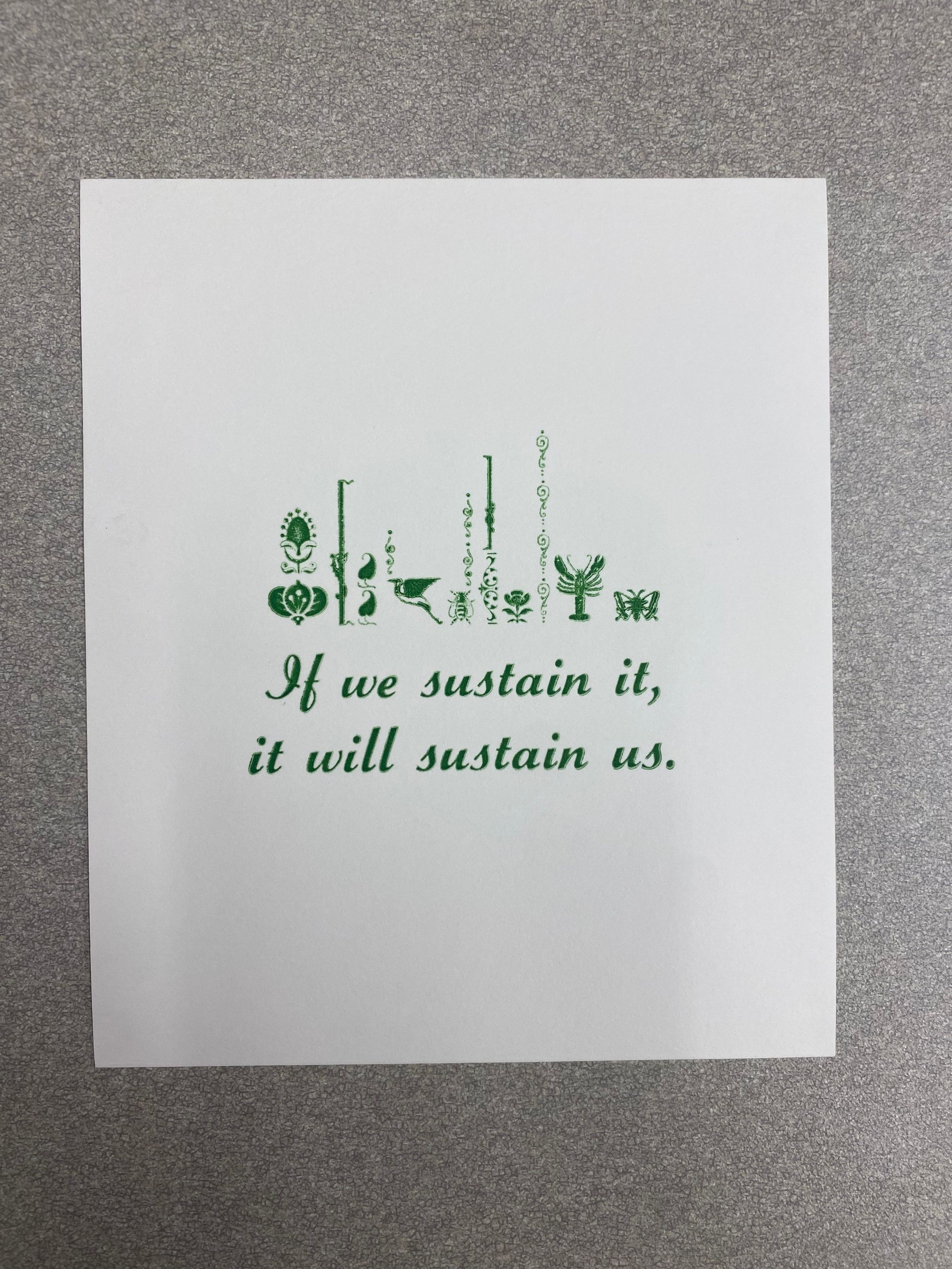A small vertically oriented print that presents the phrase "If we sustain it, it will sustain us," done in cursive and italicize. On top of the saying serves as a platform for different motifs of vegetation, animal life, and ornate detailing.Collection