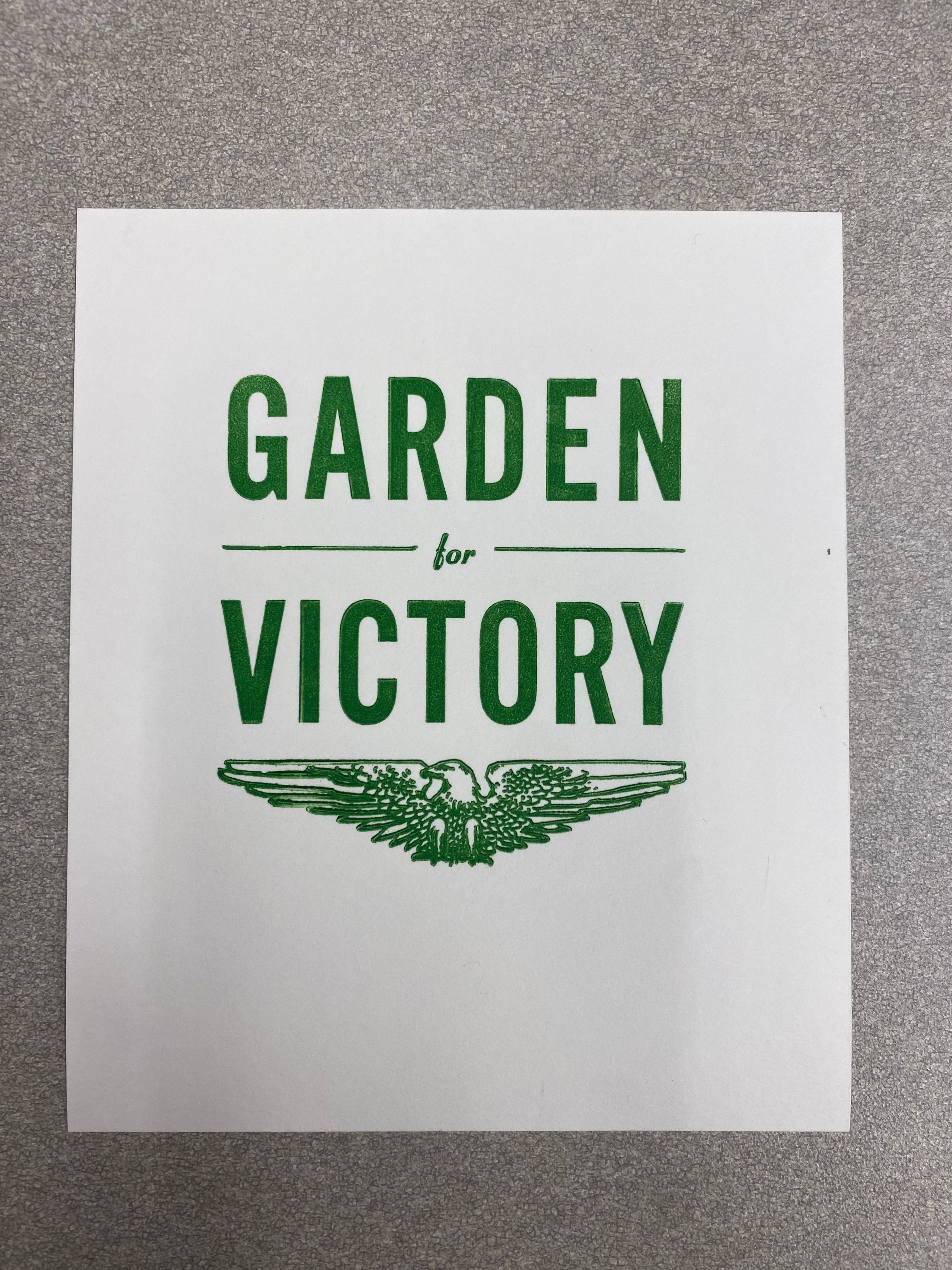 A small vertically oriented print that contains the phrase "Garden for Victory." The words "Garden" and "Victory" are all capitalized while "for" is italicize with a horizontal line flanking both it sides. Underneath the phrase an eagle with its wings stretched out and looking to the left.Collection